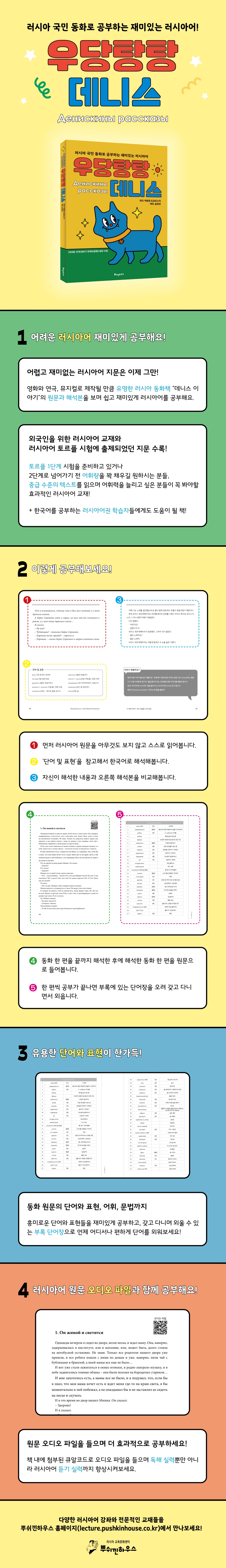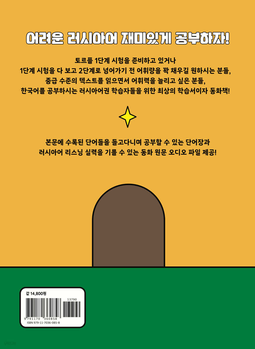 어렵고 재미없는 러시아어 지문은 이제 그만! 영화와 연극, 뮤지컬로 제작될 만큼 유명한 러시아 동화책 "데니스 이야기"의 원문과 해석본을 보며 쉽고 재미있게 공부하는 러시아어! ‘우당탕탕 데니스’에는 외국인을 위한 러시아어 교재와 러시아어 토르플 시험에 출제되었던 지문이 수록되어 있습니다. 토르플 1단계 시험을 준비하고 있거나 2단계로 넘어가기 전 어휘량을 꽉 채우길 원하시는 분들, 중급 수준의 텍스트를 읽으며 어휘력을 늘리고 싶은 분들이 보면 유용할 러시아어 교재입니다. 또한 한국어를 공부하는 러시아어권 학습자들에게도 큰 도움이 될 것입니다. 1. 러시아 원작 동화 ‘데니스 이야기’ 중 7편의 동화 수록 토르플 말하기 지문에 출제되었던 ‘영원한 비밀은 없다’를 포함한 ‘몸에서 빛이 나요’, ‘이반 코즐롭스키의 명성’, ‘어린 시절 친구’ 등 7편의 동화가 수록되어 있습니다. 데니스의 엉뚱한 행동으로 인해 벌어지는 유쾌한 이야기들을 읽으며 재미있게 러시아어 공부를 할 수 있습니다. 2. 이렇게 공부해보세요! 먼저 왼쪽 페이지의 러시아어 원문을 아무것도 보지 않고 스스로 읽어봅니다. '단어 및 표현'을 참고해서 한국어로 해석해봅니다. 자신이 해석한 내용과 오른쪽 해석본을 비교해봅니다. 동화 한 편을 끝까지 해석한 후에 해석한 동화 한 편을 원문으로 들어봅니다. 한 편 씩 공부가 끝나면 부록에 있는 단어장을 오려 갖고 다니면서 외웁니다. 3. 유용한 단어와 표현이 한가득! 동화 원문의 단어와 표현, 어휘, 문법까지 흥미로운 단어와 표현들을 재미있게 공부하고, 갖고 다니며 외울 수 있는 부록 단어장으로 언제 어디서나 편하게 단어를 외울 수 있습니다. 4. 러시아어 원문 오디오 파일과 함께 공부해요! 원문 오디오 파일을 들으며 더 효과적인 학습이 가능합니다. 책 내에 첨부된 큐알코드로 오디오 파일을 들으며 독해 실력뿐만 아니라 러시아어 듣기 실력까지 향상시킬 수 있습니다. |