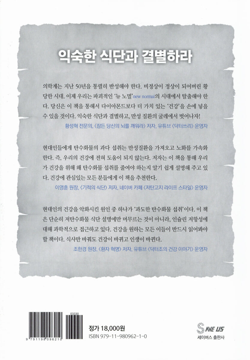 의학계는 지난 50년을 통렬히 반성해야 한다. 비정상이 정상이 되어버린 황당한 시대. 이제 우리는 파괴적인 ‘뉴 노멀’new normal의 시대에서 탈출해야 한다. 당신은 이 책을 통해서 다이아몬드보다 더 가치 있는 ‘건강’을 손에 넣을 수 있을 것이다. 익숙한 식단과 결별하고, 만성 질환의 굴레에서 벗어나자! - 황성혁 (전문의, 『잠든 당신의 뇌를 깨워라』 저자, 유튜브 [닥터쓰리] 운영자)