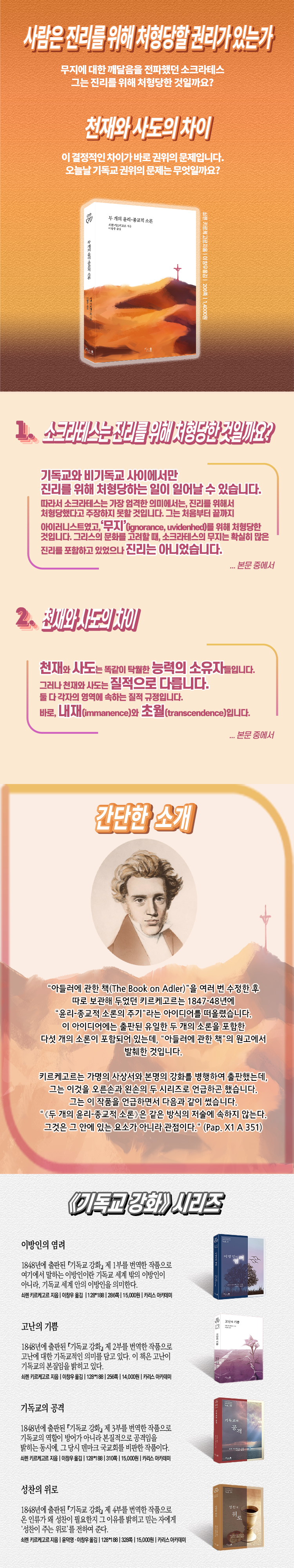이 책은 단순한 출판물을 넘어서, 삶과 철학에 관한 탐구이자 깊은 대화의 시작점이 될 것입니다. 여러분의 지식과 사유의 지평을 넓힐 수 있는 기회이며, 키르케고르의 깊이 있는 텍스트를 현대적 맥락으로 재해석하여 우리 시대에 필요한 메시지를 전달하고자 합니다.