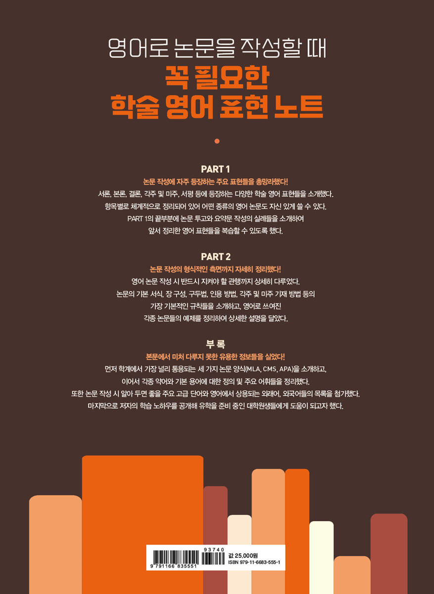 Ⅰ 논문의 기본 내용 1. 전통적인 논문 작성 과정 2. 인문사회과학과 자연과학 논문 간의 주요 차이점 Ⅱ 서론에 자주 등장하는 표현 1. 문제 제기 2. 논문의 범위 설정 3. 논문의 목적 / 방향성 / 개요 Ⅲ 본론에 자주 등장하는 표현 1. 충만 / 지배 / 일관 / 점철 2. 해석 가능성 / 타당성 3. 유사점 / 동일시 / 등가물 / 병치 관계 4. 차이점 / 대조 5. 측면 / 관점 / 입장 / 고려 6. 제시 / 제공 / 부여 7. 기능 / 역할 8. 중심점 / 초점 / 할애 9. 언급 / 관계 / 관련성 10. 암시 / 예시 / 예견 / 힌트 11. 환기 / 상기 / 연상 12. 사용 기법 13. 화법 / 화자 / 서사 기법 14. 작품 구조 15. 삽입구 / 부사구 / 접속사 16. 텍스트 인용 17. It ~ that 구문의 다양한 활용법 18. 도치 구문 19. 순위, 등수 차지 Ⅳ 결론에 자주 등장하는 표현 1. 본론의 요약과 결론 제시 2. 질정을 바라는 저자의 희망 / 여전히 남아 있는 문제점 지적 V 챕터 전환 및 문맥 흐름 언급에 자주 등장하는 표현 Ⅵ 각주 및 미주에 자주 등장하는 표현 1. 재인용 방법 2. 논문에서 이용하는 텍스트의 출처 언급 3. 반복되는 주요 텍스트 생략법과 저자의 특별한 언급 4. 다른 논문에 대한 언급 5. 연구 현황에 대한 언급 6. 감사의 표현 7. 학회 Conference 등에서 발표된 논문에 대한 언급과 박사학위 논문에 대한 언급 Ⅶ 서평에 자주 등장하는 표현 1. 애정 / 열정의 소산 / 관심의 성장 / 결실 2. 책의 내용에 대한 구체적인 언급 3. 책의 구성과 편집에 대한 언급 4. 책의 장단점에 대한 언급 Ⅷ Acknowledgement 1. 연구를 하게 된 동기 / 세월 2. 연구비 / 장학금 / 도서관 시설 등 각종 혜택 언급 3. 특별한 감사의 표현 4. 가족과 부모 / 지인 / 스승에 대한 감사의 표현 5. 독자 제현에 대한 언급 Ⅸ 이력 Curriculum vitae 소개에 자주 등장하는 표현 RESUME Sample-1~7 X 논문 투고와 요약문 작성의 실례 Sample-1~36 PART 2 Ⅰ 논문의 기본 형식 1. 기본 서식 2. 기본 구성 3. 장 chapter의 구성 4. 구두법 Punctuation 부록 1. 논문 작성 방식 소개 2. 기본 약어 Common Scholarly Abbreviations 3. 기본 용어 정의 Glossary 4. 이탤릭체로 표현되는 외래어 5. ‘, with ~’ 전치사 구문 6. 대학원생들을 위한 조언 |