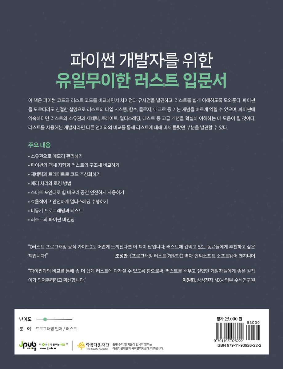 강력한 시스템 프로그래밍 언어라고 해서 꼭 어렵고 힘들게 익혀야 할까요? 이 책과 함께라면 더 이상 그럴 필요가 없습니다. 파이썬을 익히는 데 어려움이 없었다면 러스트도 문제없이 배울 수 있다는 자신감을 주거든요. 《러스트 프로그래밍 공식 가이드》도 어렵게 느껴진다면 이 책이 답입니다. 러스트에 겁먹고 있는 동료들에게 추천하고 싶은 책입니다! - 조성만 (《프로그래밍 러스트(개정판)》 역자, 엔씨소프트 소프트웨어 엔지니어)