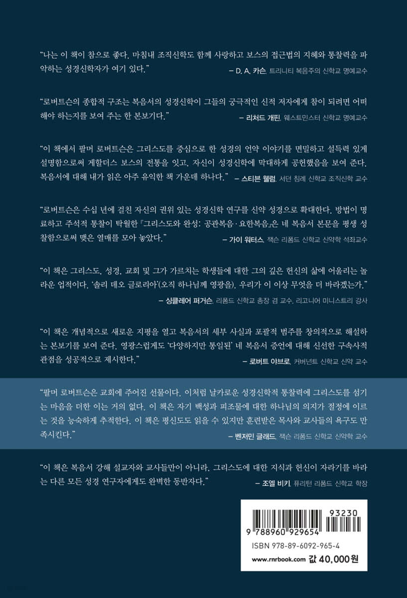 추천사 D. A. 카슨 추천사 리처드 개핀 저자 서문 감사의 글 약어표 1. 서론 A. 예수, 성경에 약속된 그리스도 B. 신약 성경신학의 본질, 방법, 특징 1. 신약 성경신학에 대한 선택적 접근법 a. 제목 또는 주제 접근법 b. 성경책 접근법 c. 구속사 접근법 2. 이 책 연구의 특징 a. 새 언약 계시의 다양한 단계를 거친 역사적 진행을 조직 원리로 되짚어 봄 b. 구약 성경의 토대로서의 역할 c. 신약 성경신학의 현대적 적용: 다양한 신약 성경 저자의 공인된 목표를 이루기 위한 노력 C. 요약 2. 준비를 위한 계시들 A. 수태고지 B. 세례 요한과 예수의 세례 C. 마귀와의 대결 3. 예수의 자기 증언 A. 자기 자신에 대한 구약 성경의 증언과 관련된 예수의 자기 증언 B. 최초로 기록된 예수의 말씀에 나타난 예수의 자기 증언 C. 자기에게 적용하거나 다른 사람들이 그렇게 부르는 것을 받아들이는 지칭을 통한 예수의 자기 증언 1. 인자 a. 하나님이 에스겔을 “인자”로 지칭하심 b. 시편 8:4-5 c. 다니엘 7:13-14 d. 시편 80:17 2. 메시아 a. 예수께서 사마리아 여인에게 “메시아” 호칭을 확언하심(요 4:19-26) b. 예수께서 베드로가 자기에게 붙이는 “메시아” 호칭을 받아들이심(마 16:13-21) c. 예수께서 이스라엘 대제사장이 자기에게 붙이는 “메시아” 호칭을 받아들이심(마 26:57-68; 참고. 막 14:53-65; 눅 22:66-71) d. 예수께서 “메시아” 호칭을 부활 후에 자기에게 적용하심(눅 24:13-27) 3. 하나님의 아들 a. 예수를 하나님의 아들로 제시하는 공관복음의 증언 (1) 예수께서 다른 사람들이 자신의 신적 아들 신분을 확언하는 것을 받아들이심 (2) 예수께서 간접적으로 자신의 유일한 아들 신분을 확언하심 (3) 예수께서 하나님을 직접 “아버지”로 부르심으로써 자신의 유일한 아들 신분을 드러내심 b. 요한복음에 나타난 예수와 그의 아버지 (1) 예수께서 아들로서의 자신의 선재성을 알고 있음을 표현하심 (2) 예수께서 자기 아버지와의 지속적 연합을 확언하심 (3) 예수께서 아버지에게서 받은 자신의 사명을 알고 있음을 나타내심 (4) 예수께서 자신이 아버지의 특별한 아들로 사랑받고 있음을 확신 있게 표현하심 (5) 예수께서 유일한 아들로서 아버지께 돌아가기를 간절히 고대하심 4. 추가 호칭들과 결론 4. 예수: 생애와 사역 A. 예수의 가르침 사역 1. 예수의 가르침의 방법 2. 예수의 가르침의 내용 B. 예수의 이적 사역 1. 창조된 우주에 대한 능력 2. 질병과 사망에 대한 능력 3. 귀신들에 대한 능력 5. 복음서에 나타난 하나님 나라의 점진적 계시 A. 왕과 천국의 임함을 위한 전주곡 B. 천국의 임함에 대한 최초의 선포 C. 메시아 왕의 사역을 통한 천국에 대한 계시의 첫 단계 1. 천국에 대한 계시의 점진적 진행으로서의 예수의 가르침 사역 a. 천국에서 “아버지”가 되시는 하나님 b. 천국에서 감당해야 할 책임 2. 천국에 대한 계시의 점진적 진행으로서의 예수의 치유 사역 3. 천국에 대한 계시의 점진적 진행으로서의 예수의 제자들의 부르심과 사명 위임 D. 제자들이 예수를 메시아로 고백할 때 나타난 왕과 나라에 대한 계시의 점진적 진행 E. 메시아 왕이 왕의 성읍 예루살렘에 입성할 때 나타난 천국에 대한 계시의 점진적 진행 F. 이스라엘의 대제사장과 로마 총독 앞에서 메시아 왕으로서의 예수에 대한 계시의 점진적 진행 1. 이스라엘의 대제사장 가야바 앞에서 2. 세속적 재판장 빌라도 앞에서 G. 십자가에 들림: 낮아짐으로 높아지신 왕 예수 H. 예수의 메시아 나라의 결정적 확증으로서의 부활과 승천 I. 결론 6. 예수: 죽음, 장사, 부활, 승천 A. 예수의 죽음 B. 예수의 장사 C. 예수의 부활 1. 예수의 부활에 대한 증언 2. 예수의 부활이 갖는 중요성 D. 예수의 승천 전환기 7. 복음서 신학자들 A. 공관복음 1. 공관복음의 통일된 증언 a. 공관복음에 나타난 복음 이야기의 포괄적 구조 (1) 예수의 사역에 대한 준비 (2) 민족들의 갈릴리에서 시작된 최초의 설교 (3) (사실상 같은 순서를 따르나 곳곳에 배치된) 치유 사역 (4) 제자들의 형성 (5) 논쟁 문제 (6) 비유를 통한 가르침 (7) 피조물에 대한 능력 (8) 자기 계시 (9) 마지막 때에 대한 가르침 (10) 예수의 생애 마지막 주에 주어진 결정적 질문들 (11) 이스라엘의 거부와 이스라엘에 대한 심판 (12) 예수의 수난 (13) 예수의 부활 (14) 요약 b. 세 공관복음에서 다 확인되는 고전적 진술들 (1) 예수의 세례에서 (2) 레위의 부르심에서 (3) “인자” 진술에서 (4) 제자의 조건 선포에서 (5) 이스라엘의 거부에 대한 예수의 비유에서 (6) 네 번의 비판적 질문에 대한 예수의 답변에서 (7) 마지막 대화에서 c. 추가 고전적 진술들 d. 분석 2. 마가복음: 특징적 증언 a. 마가복음을 베드로와 연관시키는 최초 전승들 b. 마가복음을 베드로와 연관시키는 마가복음 본문들 c. 마가복음의 주요 공헌 (1) 예수의 생애와 사역의 주요 개요 (2) 큰 무리에 에워싸임과 한적한 곳을 찾으심의 교차 (3) 마가가 예수께서 수시로 침묵을 명하는 것을 기록함 (4) 마가복음에 나타난 생생한 어휘와 상세한 세부 묘사 (5) 마가복음에 나타난 구약 성경의 결정적 역할 d. 마가복음의 특징적 복음 증언에 대한 결론 3. 마태복음: 특징적 증언 a. 마태복음의 특유한 소개 내용 (1) 