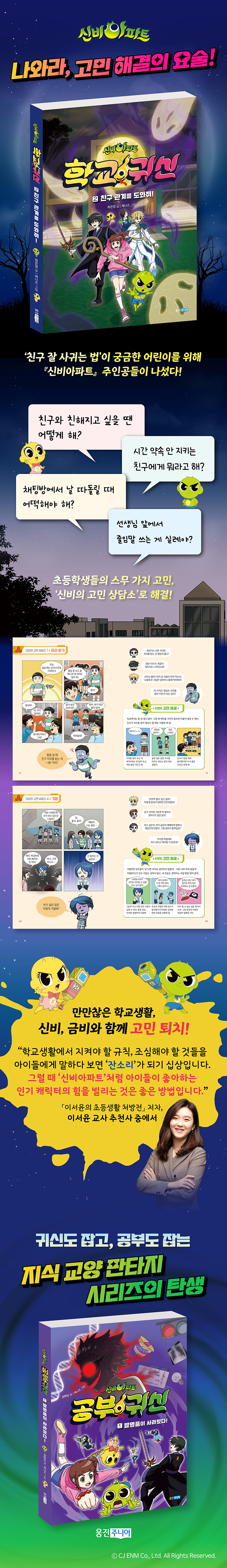 선생님, 친구와의 관계에서 지켜야 할 에티켓을 아이들에게 말하다 보면 ‘잔소리’가 되기 십상입니다. 그럴 때 ‘신비아파트’처럼 아이들이 좋아하는 인기 캐릭터의 힘을 빌리는 것은 좋은 방법입니다. 『신비아파트 학교 귀신 2』 에는 친구 사귀기, 식사 예절, 디지털 생활 등 다양한 팁이 자연스럽게 녹아 있어서 저도 참 재미있게 읽었답니다. 이 책이 즐거운 친구 관계를 위한 재미있는 잔소리가 되기를 바랍니다. - 이서윤 (초등학교 교사, 『두근두근 1학년을 부탁해』 저자)