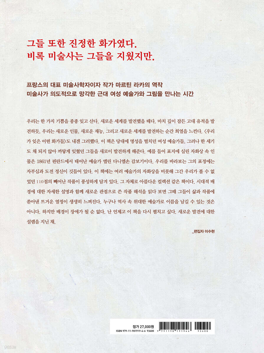 에밀리 샤르미, 자클린 마르발… 이들의 이름을 들어보았는가? 두 사람은 야수파와 동시대에 활동했으며, 야수파의 특징을 고스란히 지닌 작품을 그렸다. 샤르미는 대담한 붓질, 분명한 색채, 미완성된 표면 등을 통해 소위 ‘야수파’ 남성 화가들에 전혀 뒤지지 않는 작품을 탄생시켰다. 마르발은 또 어떤가. 야수파의 탄생을 알린 1905년 살롱 도톤에도 참여한 마르발의 작품은 독창적이고 에너지가 넘치며 야수파 화가들과의 유사성이 잘 드러난다. 그러나 두 사람의 이름은 야수파 역사에서 언급되지 않는다. 저자가 소환하는 놀라운 작품들을 보면, 현대의 관객인 우리는 그동안 훌륭한 작품을 감상할 소중한 기회를 잃었다는 기분마저 든다. 저자는 이 책을 통해 그들의 정신과 작품들을 함께 향유할 수 있기를, 미래에는 또 다른 샤르미와 마르발이 나타나지 않기를 바란다. 새로운 작품을 풍성하게 담은 아름다운 책. 이 책은 그동안 주목받지 못했던 새롭고도 놀라운 작품들을 소개한다. 박물관 창고 한 켠에 있는 작품, 개인이 소장한 작품, 여기저기 떠돌아다니는 작품들을 수집한 컬렉션이나 다름없다. 저자는 이들 작품이 당시에 어떤 과정으로 그려졌는지, 어떤 평가를 받았는지, 작품이 의도하는 바와 기법, 주제는 무엇인지 등을 자세히 설명한다. 저자를 따라 110점의 그림을 감상하다 보면 이 작품들이 분명 미술관에 당당히 자리해야 할 작품임을 느끼게 될 것이다. 그리고 어느새 그들의 작품을 진지하게 고찰하는 자신을 발견하게 될 것이다. 성별에 따른 평가가 아닌, 그저 작품 그 자체만으로 인정받고 기억되는 일. 그것이 그녀들이 진정 원하는 것 아니었을까? 잊힌 여성 화가들을 기리기 위하여. 그들이 잊힌 이유를 단순히 성별 때문이라고 볼 수는 없다. 저자는 그들이 처했던 당시의 정치적, 사회적, 제도적, 경제적 상황에 비추어 그들이 잊힌 이유를 다각도로 분석한다. 모든 것이 격변하던 19세기에 여성 화가들이 외부의 압력에 어떻게 대처했는지, 어떤 전략과 방법을 썼는지를 살피다 보면 예술에 대한 그들의 뜨거운 사랑과 헌신을 마주하게 된다. 누군가는 평단의 혹평을 받고 사라지기도 했고, 누군가는 비난을 이겨내고 당대의 명성과 성공을 얻어내기도 했다. 그들은 생전에 본인들이 이토록 까맣게 잊힐 줄 알았을까? 자신의 삶과 작품에 열정을 불태웠던 그들의 영혼을 이제라도 돌아보면 어떨까? |