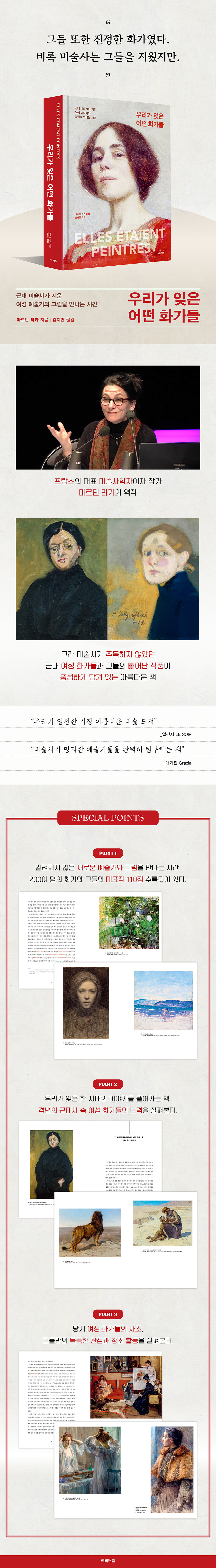 --- p.25 찾아보면 역사가 ‘눈에 보이지 않게’ 만든 여성 화가들의 작품을 발견할 수 있다. 그중에는 그들이 회화에 완벽히 숙달해 있었음이 드러나며, 따라서 그들이 잊힌 이유가 서툰 아마추어리즘 때문이 아님을 알게 해주는 작품이 많다. 그리고 야망, 투지, 끈기의 결과로 성공과 명예를 얻은, 그래서 여성의 대의를 이룬 영광스러운 주역에 당당히 이름을 올릴 만한 여성 화가의 작품도 많다. --- p.26 이 책에서 다루는 그 오랜 기간 동안 미술관이나 전시회에 걸리는 명예를 얻지는 못했지만, 더 많은 대중이 볼 수 있도록 공간을 내어줄 가치가 있는 작품과 예술가가 예상 외로 많다. 쇠이유 출판사에서 이 ‘아름다운 책’을 통해 호기심 많은 이들에게 소개하는 여러 작품과 예술가처럼 말이다. 이 책은 주제별 접근방식을 따라 종종 창고에서 잊혔거나, 개인 소장품으로 고립되어 있거나, 판매시장에서 여전히 비자 없이 방황하는 작품들을 모아놓은 저술이다. 감상하는 즐거움만큼이나 오래 그리고 자주 이 작품들과 재회할 수 있다. 그저 그림을 그리는 일, 아무것도 요구하지 않는 그 몸짓을 계속 기억하고자 만든 책이다. --- p.31 사라쟁 드 벨몽은 살롱전에서 자신의 존재를 능숙하게 드러낼 줄 알았을 뿐 아니라 사설 미술시장에도 공을 들여, 살롱전 밖에서 자신을 홍보하는 동시에 여행에 필요한 자금과 재정적 자율성을 확보했다. 그는 자신의 작품을 경매를 통해 판매한 최초의 화가였다. 1839년 2월 24일에 발행된 『화가 저널: 전 세계 화가와 사람들을 위한 그림 잡지』는 ‘마드모아젤 사라쟁 드 벨몽의 습작 전시회가 다음 날 부르스 광장에서 열릴 것’이라고 보도했다. 앙젤리크 몽제처럼 사라쟁 드 벨몽이 작품 일부를 박물관에 기증한 사실에도 주목할 필요가 있다. 예를 들어 몽제는 1865년 투르 박물관에 〈로마의 풍경(1860) 두 점을 제공했는데, 이는 자신이 기억될 수 있는 장소를 마련함으로써 국가의 미술사에서 자기 자리를 확보하겠다는 적극적인 의지로 읽힌다. --- p.112 살롱전과 그 수상 제도가 경력에 미치는 영향을 잘 알고 있던 여성 화가들은 자화상도 적극 활용했다. 예를 들어 앙리에트 로리미에는 1807년의 〈자화상〉(도판28, --- p.106)에서 붓과 팔레트를 손에 들고 있다. 마치 관객을 의식해 그림 그리기를 중단한 듯한 모습인데, 입고 있는 우아한 벨벳 드레스는 그림 작업과는 어울리지 않아 보인다. 뒤쪽 이젤에는 당시 작업 중인 작품이 아니라 이미 1804년에 그의 경력을 한발 나아가게 해준 그림 〈젖 먹이는 염소〉가 놓여 있다. --- p.113 1909년 수잔 발라동은 자신의 그림 〈아담과 이브〉(도판33, --- p.120)에서 벌거벗은 이브로 등장하면서 그 옆에 스물한 살 연하의 연인 앙드레 우터를 아담으로 등장시켰다. 이 그림은 한 여성 화가가 연인의 누드, 그 주제가 전통적으로 상징하는 육체적 사랑, 뱀도 원죄도 없는 에덴동산, 노골적으로 묘사된 커다란 두 육체를 둘러싼 에덴동산의 녹음을 찬양한 작품이다. 1920년 살롱 도톤에서 이 작품을 통해 사랑의 환희와 그림 그리는 기쁨을 선보였을 때, 그는 연인의 남성성을 약간의 덩굴 그림으로 가리도록 강요받았고 혹독한 비판과 심지어 모욕까지 견뎌야 했다. 그러나 발라동은 이후에도 회화에서 남성 누드에 대한 탐구를 포기하지 않았다. 1914년의 〈그물 던지기〉(도판34, --- p.122)에서는 덩굴 대신 밧줄을 활용했지만, 발라동은 더욱 꿋꿋하게 남성 누드를 그리면서 움직이는 신체와 자연 형태의 에너지 사이의 관계에 질문을 던지고 둘 사이의 공통점을 모색하려 했다. --- p.121 에밀리 샤르미는 대담한 붓질, 분명한 색채, 미완성된 표면 등을 통해 소위 ‘야수파’ 남성 화가들과 전혀 다르지 않고 때로는 더 뛰어난 방식으로 ‘꽃다발’에 접근했다. 그러나 질 페리가 지적한 것처럼, 비평가들은 꽃 그림에서 ‘야수’의 의미와 어울리고 모더니즘의 기준과 일치하는 과격하고 남성적인 힘의 발현을 보았음에도, 여성 화가들의 꽃 관련 작품에서는 색채에 대한 전적으로 여성적인 감수성만을 보았다. [...] 에너지 넘치는 기법, 임파스토와 붓놀림을 통해 미묘한 차이를 표현하는 절제된 팔레트, 지형에 커다란 변화를 주고자 디테일을 무시한 점 등은 이 여성 화가의 예술적 자율성과 독창성을 증명하지만, 그 이름은 야수파 역사에서 거의 언급되지 않는다. --- p.137 “‘저 여자는 남자다’라는 말이 계속 귓가에 맴돌았다. […] 마치 내 성별은 하찮다는 불치의 선고를 받은 것처럼, 그 성별이 만든 작품은 항상 나약함과 오랜 무지함을 특징으로 지니고 있는 것처럼 말이다. [...] 어떤 예술작품을 두고 ‘여성의 그림 또는 여성의 조각품’이라고 말할 때, 사람들은 그것을 ‘신통찮은 그림 또는 시시한 조각품’이라는 뜻으로 이해한다. 여성의 두뇌와 손으로 만든 작품을 대단하다고 판단해야 할 때, 사람들은 ‘마치 남성이 만든 것 같은 그림 또는 조각품이다’라고 말한다. 이 두 가지 상투적인 표현을 비교하면, 굳이 설명할 필요도 없이 여성 예술에 대한 선입견을 증명할 수 있다.” --- p.145 마르발은 1915년에 〈애국 인형들〉(도판44, --- p