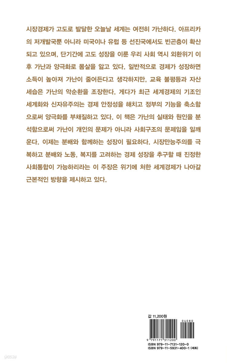 제1장 여전히 가난한 세계 1. 당신은 가난한가 (1) 가난이란 무엇인가 (2) 절대적 혹은 상대적 빈곤선 (3) 가난의 현실 (4) 빈곤의 경제학 2. 세계 속의 가난한 사람들 (1) 전 세계에 만연한 가난 (2) 아프리카의 비극 (3) 경제가 침체된 개도국의 가난 3. 선진국의 숨겨진 가난 (1) 미국-부서진 아메리칸 드림 (2) 일본-갈라지는 열도 (3) 유럽-사회통합을 가로막는 가난 (4) 통계에 나오지 않는 가난 4. 신자유주의 세계화와 가난 (1) 세계화와 신자유주의 (2) 경제 성장과 빈곤의 두 얼굴 (3) 전 세계적 양극화 제2장 가난의 경제학 1. 가난을 해결하기 위한 노력 (1) 경제성장, 만병통치약인가 (2) 자원, 종교 그리고 경제 성장 (3) 경제 정책과 거시 경제 2. 가난을 딛고 경제 성장으로 (1) 경제 성장은 어떻게 이루어지는가 (2) 가난의 악순환 끊기 (3) 국제 사회의 협력과 도움 (4) UN 밀레니엄 개발목표와 아프리카 돕기 3. 소득분배와 경제 성장을 동시에 추구하기 (1) 양극화, 성장의 덫 (2) 성장 대 분배에서 성장과 분배 4. 빈곤층에 도움이 되는 성장 (1) 평등주의적 발전과 동아시아의 기적 (2) 잠을 깨는 용, 중국의 성공 (3) 세계은행이 얻은 교훈-빈곤층을 위한 성장 제3장 우리 안의 가난 - 한국의 현실 1. 가난과 양극화의 덫 (1) 가난에 빠진 한국 (2) 아, 양극화! (3) 강남불패와 부동산제국 2. 신자유주의, 세계화 그리고 한국의 가난 (1) 구조조정과 전면적 대외 개방 (2) IMF의 역사적 쇼크와 노동시장 (3) 구조적 저성장과 양극화의 심화 맺는말 감사의 글 주 더 읽어야 할 자료들 |