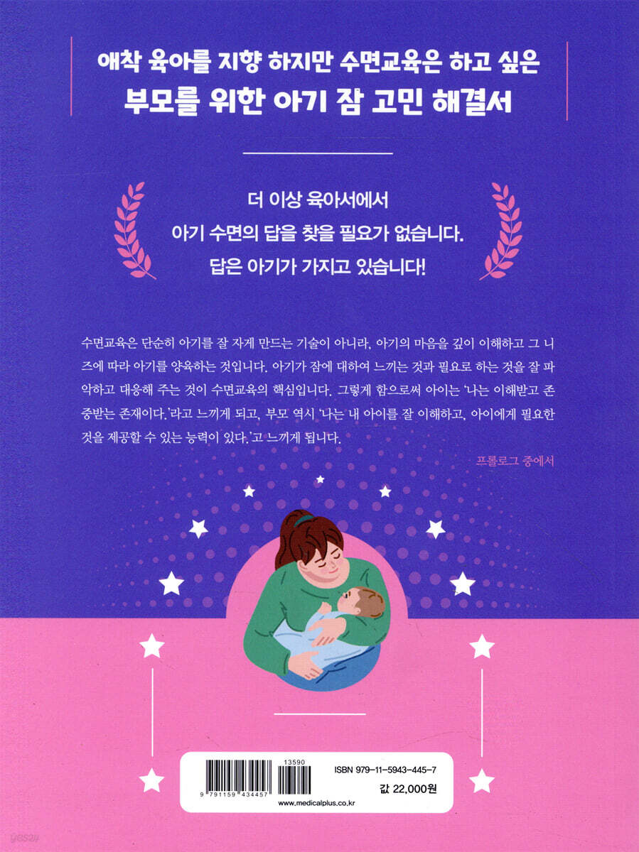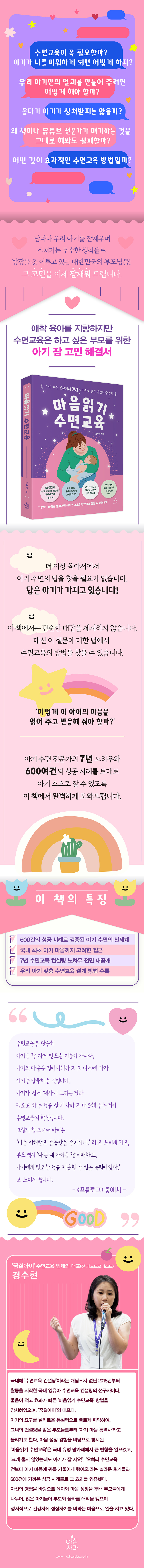 《마음읽기 수면교육》은 전통적인 수면교육의 틀을 넘어서는 독창적이며 획기적인 접근법을 제시합니다. 이 책은 단순한 수면 교육서가 아닙니다. 부모가 아이의 잠에 대한 욕구와 마음을 이해하고 존중하는 방법을 가르치며, 아이가 편안하게 잠들 수 있도록 돕습니다. - 전송이 (가톨릭관동대 간호학과 조교수)