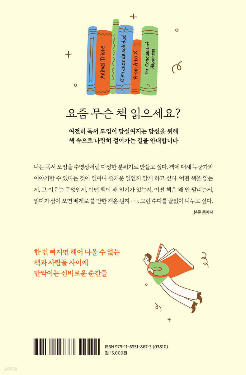 --- p.16 「1장_혼자 읽던 사람이 함께 읽는 사람이 되기까지」중에서 책을 지나치게 진지하게 대하느라 양미간에 주름이 잡히면 이러지 말자며 서로서로 주름을 펴준다. 우리는 책을 사랑하면서 읽고 책을 귀여워하면서 읽는다. 책을 옆구리에 낀 아홉 명의 친구와 둥그런 원을 그리며 느릿느릿 강강술래를 한다. --- p.21 「1장_혼자 읽던 사람이 함께 읽는 사람이 되기까지」중에서 나는 원래 책 모임을 좋아하지 않았다. 책 읽을 시간도 부족한데 그 시간에 다른 책을 더 읽는 게 낫지 모여서 무슨 할 이야기가 그렇게 많다고 정기적으로 만나기까지 하나. 책을 읽은 사람들의 생각이 궁금하면 책에 관해 쓴 책을 찾아 읽으면 그만이라고 생각했다. 왔다 갔다 하는 걸 번거롭게 여겼고 소란스러운 것도 싫었다. 그런데 자꾸 마음에 변화가 생겼다. --- p.25 「1장_혼자 읽던 사람이 함께 읽는 사람이 되기까지」중에서 다들 잊었는지 모르지만 사실 어린 시절에는 누구나 이야기를 듣고 싶어 했다. 밤마다 엄마나 할머니에게 아무 이야기나 해달라고 조르지 않았나. 그런데 어른이 되고는 많은 이가 이야기로부터 멀어진다. --- p.73 「2장_책을 나누고 사람에게 배우며」중에서 자기가 참여하는 건 분명히 독서모임이지만 그 신비로운 순간은 단순히 책에만 있지 않다고 했다. 책과 자기의 마음과 독서모임에 참여하는 사람들의 마음 사이사이에 난 길 어딘가에 있었다는 것이다. 자기는 그 좁은 길에서 작고 반짝이는 걸 발견했는데 그걸 한 마디로 무엇이라고 정의 내릴 수는 없다는 것이다. --- p.81 「2장_책을 나누고 사람에게 배우며」중에서 솔직히 말해서 내 인생은 내가 어쩔 수 없는 것이 분명히 있었다. 삶에는 어느 정도 계획이 필요하다는 말에 동의하지만, 계획을 세워도 계획대로 되는 건 많지 않았다. 순간적으로 번뜩인 생각과 충동적인 선택이 마치 악마가 장난을 치는 것처럼 내가 가려는 길을 조금씩 비트는 것 같았다. --- p.133 「3장_나도 몰랐던 내가 책갈피 속에 숨어 있다가」중에서 나에게 삶이란 무엇일까. 만나는 모든 사람을 붙잡고 물어보고 싶었다. 당신은 당신의 삶이 괜찮은지, 나에게는 왜 이 삶이 이렇게나 지랄 맞은지. --- p.140 「3장_나도 몰랐던 내가 책갈피 속에 숨어 있다가」중에서 읽다 보니 책은 역시 이상하고 아이러니하고 부조리한 물건이라는 생각이 든다. 종이 다발 위에 글자를 늘어놓은 이것이 대체 무엇이 길래 사람들을 울리고 웃기고 심각하게 하고 우울하게 만드는지. --- p.190 「4장_매일 깊고 넓어지기를 바라며」중에서 거부했던 책을 받아들일 때, 마음의 준비가 없이 어떤 책이 훅 들어왔을 때, 내게 맞지 않는 책이라고 밀어놨던 책이나 완전히 엉뚱한 책이라서 아예 눈 밖에 있던 책을 읽었을 때 책 읽기의 재미가 더 커졌다. --- p.192 「4장_매일 깊고 넓어지기를 바라며」중에서 그러니까 책을 읽으며 ‘나만 이렇게 불편한가? 나만 재미없나?’ 하는 고민은 할 필요가 없다. 읽다가 불편하거나 도저히 못 읽겠다 싶으면 언제든 책을 덮으면 된다. --- p.227 「4장_매일 깊고 넓어지기를 바라며」중에서 지난 7년 동안 서재가 있는 호수 독서모임에서 나와 비슷하게 책을 많이 읽는 이상한 사람들을 만났다. 우리도 우리가 이상한 걸 알기 때문인지 책을 왜 좋아하게 됐는지 서로에게 물어볼 때가 있다. 우리는 매번 답을 찾지 못하고 책을 좋아하는 이상한 사람이라는 공통점만 발견한다. --- p.237 「에필로그_리듬을 이어가며 그냥 계속 읽고 나눕니다」중에서 |