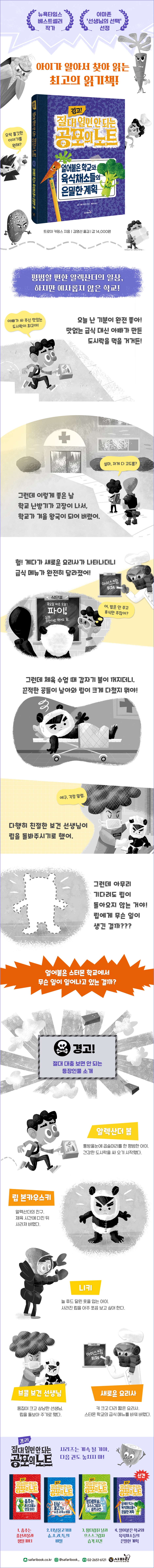 ★ 아마존 ‘선생님의 선택’ 도서로 선정! 아이들이 세상을 구하는 통쾌하면서도 오싹 쫄깃한 이야기! 알렉산더가 우연히 발견한 〈공포의 노트〉에는 상상력 넘치는 온갖 무시무시한 괴물들로 가득하다. 각각의 괴물들을 그려 놓은 그림과 함께 서식지, 먹이, 특징 그리고 물리치는 방법 등이 적혀 있어 무서워하거나 당황하지만 않는다면 거뜬히 괴물을 이겨 낼 수 있다. 이 시리즈는 공포의 노트에 있는 괴물들이 스터몬에 나타나 도시를 위험에 빠뜨리지만 아이들의 힘으로 물리치는 이야기여서 그야말로 통쾌하다. 어린이 독자들이 이 시리즈를 좋아할 뿐 아니라 자발적으로 계속 읽게 되는 이유 중 하나도 아이들 스스로의 힘으로 괴물을 물리치고 세상을 구하기 때문이다. 그리고 무서운 괴물 이야기지만, 어찌 보면 귀여울 수도 있고 물리칠 방법도 있다 보니 지나치게 공포스럽지 않아 저학년 아이들이 읽기에 자극적이거나 해롭지 않다. 무엇보다 이 시리즈는 책을 읽고 나서 스스로 독후 활동까지 한다는 점에서 더욱 만족감이 커진다. ‘나만의 공포의 노트’를 만들거나 친구들 혹은 가족과 괴물 퇴치 모임을 만들고 회원 카드를 만드는 모습도 목격하게 될 것이다. 독서 습관을 키워 주고 싶다면, 제대로 된 문장력과 문해력, 문제 해결력을 키워 주고 싶다면 만화보다 〈공포의 노트〉 시리즈를 권한다. 채소들의 반란-이제 너희가 먹힐 차례야! 스터몬 초등학교는 맛없는 급식으로 유명하다. 그래서 립은 늘 점심을 먹을 때마다 구토를 유발하는 메뉴 때문에 힘들어하며 투덜거린다. 알렉산더 아빠는 먹기 괴로운 급식 대신 영양 가득한 채소를 듬뿍 넣어 건강한 도시락을 준비한다. 그런데 하필 그날 점심부터 급식 메뉴가 완전히 달라진다. 다양한 토핑을 얹어 취향껏 골라 먹을 수 있는 아이스크림 뷔페에 이어 다음 날엔 달콤한 온갖 파이가 나온다. 아이들은 갑자기 싹 바뀐 점심 메뉴에 환호하지만 알렉산더는 의문을 품으며 수상하게 여긴다. 그러자 립과 니키는 알렉산더가 아이스크림이나 파이 대신 채소만 잔뜩 담긴 맛없는 도시락을 먹어야 해서 부러워 그러는 거라고 단정해 버리는데···. 〈경고! 절대 열면 안 되는 공포의 노트〉 시리즈의 네 번째 이야기 《얼어붙은 학교와 육식채소들의 은밀한 계획》에서는 다양한 육식채소들이 등장한다. 육식채소? 채소는 비육식인데 육식을 하는 채소라니! 게다가 채소들이 비밀스레 계획을 세우다니 제목만으로도 흥미롭고 궁금해진다. 대체로 아이들은 채소를 싫어하는 반면 아이스크림과 파이는 너무나 좋아한다. 그런 심리를 십분 활용하고자 한 육식채소들의 은밀한 계획은 한편으로는 공포스럽고, 한편으로는 웃음 짓게 하지만 꽤 설득력이 있다. 채소를 먹으면 건강해진다는 이유로 다지고, 볶고, 찌고, 삶고 으깨는 등 다양한 방법으로 조리를 당해 왔던 채소들의 반란이기 때문이다. 그래서 육식채소들은 살이 금방 찌고 몸에 좋지 않지만 아이들이 절대 포기할 수 없는 달디단 디저트들만 잔뜩 먹인 뒤 기회를 엿본다. 갖가지 방법으로 조리되어 아이들의 선택을 기다리지만 늘 외면당해 온 순둥순둥한 채소들이 어느 날 갑자기 아이들을 공격하며 입맛을 다신다면? 이번 이야기는 채소들의 은밀한 계획을 통해 편식과 몸에 좋지 않은 달콤한 음식들의 유혹에 대해 생각해 보는 좋은 계기가 될 것이다. 나쁜 일이라 해도 꼭 나쁘게 끝나는 건 아냐! 스터몬 초등학교에서는 새 건물 공사 자금을 마련하기 위해 칠리 요리 행사를 준비한다. 어느 날, 알렉산더는 단짝 립, 니키와 함께 등교한 순간, 학교가 온통 꽁꽁 얼어붙을 만큼 추워 깜짝 놀란다. 그리고 이상한 사건은 그때부터 시작되는데···. 시커먼 스키 마스크를 쓴 냉난방기 수리 기사, 계속 엉엉 우는 담임 선생님과 반 친구들, 수상한 요리사 그리고 평소의 식단표와 전혀 다른 무한대 아이스크림 뷔페와 파이 급식, 제멋대로 날아다니는 끈적끈적한 초록색 공, 몸집이 큰 수북한 머리카락의 새 보건 선생님, 잔뜩 찌그러져 뽑혀 있는 도로 표지판까지 온통 이상한 일들이 줄을 잇는다. 알렉산더는 아이스크림과 파이 앞에서 행복해하며 허겁지겁 먹는 아이들에게 뭔가 잘못되고 있다고 큰소리로 말한다. 하지만 아이들이 얼굴에 파이를 잔뜩 묻힌 채 알렉산더를 빤히 쳐다보기만 하자, “나는 너희가 이 파이를 먹게 내버려 둘 수 없어! 쓰레기통에 버릴 거야!”라고 소리치며 파이를 냅다 던져 버린다. 그런데 하필이면 파이가 냉정하고 무섭기로 소문 난 밴더팬츠 교장 선생님의 얼굴을 정통으로 덮치는 바람에 방과 후에 교장실로 불려가게 된다. 알렉산더는 크게 야단맞을 거라고 생각하며 풀이 죽어 들어가지만 뜻밖에도 건강한 도시락을 먹어 줘서 고맙다는 말을 들으며 중요한 칠리 요리 행사의 학생 주방장으로 임명된다. 그리고 교장실에서 학교가 냉동고처럼 추워져 버린 까닭과 범인이 흘렸을 법한 단서도 얻게 된다. 이 이야기는 독자들에게 2가지의 메시지를 전달한다. 하나는 모두가 맹목적으로 좋아하지만 문제가 있는 사실에 대해 “이건 잘못된 거야!”라고 말할 수 있는 