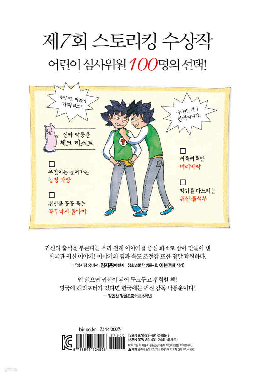 흑설충을 물리치고 사건을 해결했다는 기쁨도 잠시, 흑설충의 우두머리가 나타나 봉잎새를 납치해 간다. 탁풍운은 잎새를 구하기 위해 백 년 만에 지하계로 떠난다. 풍운은 견학 온 신선 후보생들 사이에 몰래 섞여 지하계를 살피다, 허름한 행색 탓에 후보생인 소공심에게 담력 시험에서 떨어진 낙제생으로 오해받는다. 공심은 풍운에게 귀한 ‘용의 발톱’을 건네 준다. “무서운 생각이 들 때마다 이걸 만져봐. 그러면 견딜 수 있을 거야.” _본문에서 풍운은 관원의 안내에 따라가는 후보생들의 줄에서 슬쩍 벗어난 뒤 잎새를 찾아 흑룡굴로 향한다. 그러나 풍운은 흑설충에게 끌려가는 잎새를 다시 놓치고는 살아있는 것처럼 몸에 달라붙는 모래 속에서 정신을 잃는다. 동굴로 찾아온 관원이 깨워준 덕에 겨우 눈을 뜨고 목숨을 건진 풍운은, 잎새가 남긴 꽃 메달 목걸이가 인간계로 향하는 푯말에 걸려 있는 것을 발견하고는 인간계의 집으로 돌아가기로 한다. 관원에게 풍운이 간 방향을 일러 준 사람은 공심이었다. 겁이 많은 공심에게 ‘용의 발톱’은 용기의 증표였다. 뾰족하고 매끄러운 감촉이 손에 닿으면 마음이 진정되곤 했다. 그런 소중한 물건을 공심은 자신이 공감할 수 있는 상대에게 기꺼이 내준다. 어엿한 신선인 풍운을 낙제생으로 여긴 것은 착각에 불과했을지라도 공심의 따뜻한 마음은 위기에 처한 풍운을 도와주었다. 공감과 용기가 이어준 두 사람의 새로운 인연은 어떻게 흘러가게 될까? ■진짜와 가짜를 가르는 기준, 진정한 귀신 감독의 자질이란? 풍운이 돌아온 집에는 잎새와 쌍둥이 귀신 우와 울이 있었다. 그러나 겨우 다시 만난 잎새는 뜻밖에도 풍운을 힘껏 공격하다, 풍운이 품에서 꺼낸 꽃 메달 목걸이를 보고 나서야 진정한다. “네가…… 가짜인 줄 알았어.” “가짜? 내가 둘이라도 된다는 거야 뭐야. 변명도 납득할 만한 변명을 해야 믿을 거 아니야.” (중략) “농담 아니야. 만능꽃의 힘으로 너랑 똑같은 녀석을 만들었다고…… 내가.” _본문에서 풍운은 흑설충 우두머리가 가짜 탁풍운으로 변신했다는 충격적인 소식을 듣게 된다. 공원에서 찾아 낸 가짜 탁풍운은 삐죽 머리부터 능청 가방까지 진짜를 꼭 닮았다! 두 명의 탁풍운 사이에서 싸움이 벌어지자 귀신들이 모여들고, 진짜와 가짜를 구분하기 위해 문제를 내기 시작한다. 풍운이 답이 잘 생각나지 않아 머뭇거리는 사이 가짜 탁풍운은 술술 잘 대답한다. 옛이야기 속 옹고집이 짚 인형에서 변신한 가짜 옹고집에게 신분을 빼앗긴 것처럼, 풍운은 자신이 진짜임을 증명할 수 없게 된다. 풍운은 가짜 탁풍운의 허점을 찾아 정면 승부에 나선다. 악귀와 착한 귀신을 구별할 수 있는 안목은 귀신 감독이 갖추어야 할 첫 번째 자격이다. 그러나 풍운은 직접 귀신을 관리하며 선악의 구분이 어렵다는 사실을 깨달았고, 귀신을 이해하고자 애쓰게 되었다. 가짜 탁풍운은 공정이라는 이름 아래 귀신들을 엄벌할 뿐이었지만, 풍운은 ‘귀신 감독이 무엇을 하는 존재인지’에 대해 자신의 결론을 내놓는다. 풍운이 찾은 답에는 짐짓 악하고 쓸모없다고 배척당하기 쉬운 자들을 향한 따뜻한 시선이 담겨 있다. 정체를 드러낸 가짜 탁풍운과의 마지막 대결이 흥미진진하게 펼쳐지며 귀신 감독 탁풍운의 이야기는 대단원의 막을 내린다. ▶ 전문가 심사위원단 심사평 . 귀신의 출석을 부른다는 우리 전래 이야기를 중심 화소로 삼아 만들어 낸 한국판 귀신 이야기! 이야기의 힘과 속도 조절감 또한 정말 탁월하다. -김지은(어린이·청소년 문학 평론가), 이현(어린이문학 작가) ▶ 어린이 심사위원단 심사평 . 지루한 장면이 단 한 장면도 없다. 굉장히 짜릿한 재미를 선사하는 책! -구성찬 도심초등학교 5학년 . 상상 속에나 있는 일이 현실에 실제 있는 것 같은 착각에 빠져들게 한다. 한번 들어온 인상적인 이야기는 매일매일 머릿속에서 튀어나와 깜짝깜짝 놀라게 된다. -기경서 신구로초등학교 5학년 . 원래 귀신을 믿지 않았던 내가 이 책을 읽고 귀신을 믿게 되었다. 그만큼 생생하게 그려낸 귀신 이야기다. -박민제 낙민초등학교 6학년 . 귀신 감독 탁풍운은 듣도 보도 못한 기묘하면서 신기한 이야기들을 모아 놓았다. 정말 글을 읽는 순간 머릿속에서 바로 상상이 된다. 정말 베스트셀러가 될 것 같다. -이은율 포일초등학교 6학년 . 나는 이 책을 보면서 악한 사람과 선한 사람을 가리는 눈을 가지고 싶어지는 것을 느꼈다. 이 책으로 인하여 나의 인생의 길이 열린 듯하다. -당찬위 제주제일중학교 1학년 |