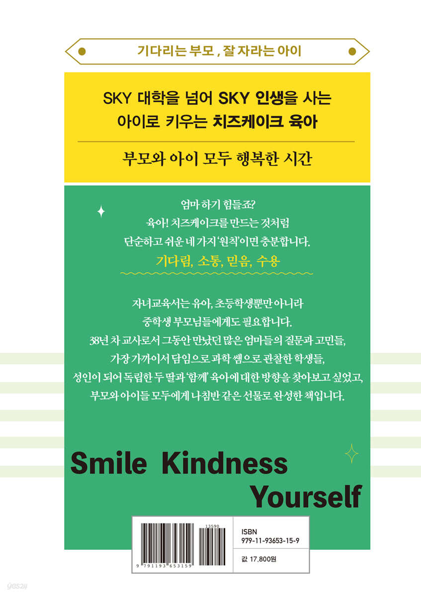 “선생님이 우리 엄마의 선생님이었다면서요? 진짜 신기해요.” 모자의 담임, 모녀의 담임을 하는 경우가 종종 있어요. 아이들과 소통하지 못해 힘들어하기도 하고, 가출한 아이의 부모로 만나기도 하고, 가끔은 일명 ‘진상 학부모’의 모습으로 마주하기도 합니다. 그럴 때는 마음의 고단함이 수십 배입니다. 나는 80년대생 학부모들이 학생이었을 때도 교사였던 사람이기 때문입니다. 학부모가 되어 다시 만나게 된 20년 전, 30년 전 우리 반 학생들. 차마 웃으며 반길 수 없는 상황에서의 해후일 때의 슬픔은 더더욱 나를 힘들게 하지요. 이 책을 쓰게 된 이유 중 하나입니다. - 프롤로그 중에서 교사로서, 두 아이의 엄마로서 수많은 선택을 하면서 살아온 저자 착한재벌샘정은 말합니다. “엄마가 당당해야 아이도 당당하다!” “엄마가 변하고 성장하는 시간이 있어야 그 아이와 함께 갈 수 있다.”라고요. 육아서는 아이가 어릴 때만 읽는 책이 아닙니다. 초등학생이 되고 중학생이 되면 아이와 부모 사이는 계속 더 멀어집니다. 아이 마음을 알아주고 부모 또한 상처받지 않으며 함께 행복할 수 있는 ‘원칙 육아’가 필요해지는 것이지요. 그 방법을 《치즈케이크 육아》에 담았습니다. SKY 인생을 살 수 있는 아이로 키우는 중심 잡힌 따뜻하고 단호한 ‘원칙 육아’ 원칙을 지키는 것은 매우 중요합니다. 엄마도 아이도 S(Smile) K(Kindness) Y(Yourself) 인생을 살 수 있는 따뜻한 육아의 시간을 소개합니다. 어렵지 않아요. 바스크 치즈케이크를 만드는 것처럼요. - 따뜻한 기다림 치즈케이크를 만드는 첫 단계, 크림치즈 500g을 실온에서 천천히 녹이는 것처럼 육아에도 ‘기다림’이 필요합니다. 엄마의 조급한 마음을 내려놓고 아이의 속도대로 갈 수 있도록 기다려주어요. 부모에게만 기다림이 필요한 게 아니라 아이에게도 자신이 하고 싶은 것을 스스로 준비하는 과정, 기다리는 시간의 경험이 중요합니다. 아이의 꿈이 내 꿈이 되지 않도록 ‘나’를 잘 보살피고, 아이와 함께 행복한 시간을 만들어갈 수 있습니다. - 달콤한 소통 크림치즈의 냉기가 사라지면 설탕 100g을 조금씩 넣으며 잘 섞어줍니다. 육아에도 달콤함이 필요해요. 달콤한 소통. “입 다물고 들어가서 공부 해!” “알아서 한다는 게 이거야?” 소통과는 거리가 먼 대화법입니다. 아이와 행복하게 대화할 언어는 없는 걸까요? 일관성과 원칙이 없는 육아는 아이들에게 ‘부모사용설명서’를 만들게 하고. 품격 없는 언어를 사용하면 그대로 아이에게 흡수됩니다. 밥도둑? 실물깡패? ‘도둑’과 ‘깡패’를 왜 좋은 단어에 붙여서 사용할까요? “언어가 곧 삶”입니다. 상대방을 위한 고운 말이 아니라 ‘나’를 위한 우아하고 품위 있는 말을 사용해야 합니다. - 유연한 믿음 크림치즈와 설탕이 잘 녹으면 이제 달걀 4개를 하나씩 잘 섞어줍니다. 달걀도 냉기가 없어야 반죽과 잘 섞입니다. 아이와의 시간도 비슷하죠? 부모와 아이의 온도 차가 크면 아이는 겉돌게 되니까요. 스마트폰 문제, 성적, 교우관계, 학교생활 등 부모가 잘 모르는 아이의 다양한 모습들. 필요한 것은 아이들 스스로 생각하는 능력이라 생각하기에, 책의 저자 착한재벌샘정은 수업시간에 책읽기와 글쓰기를 강조하고 많은 질문을 던지며 스스로 답을 찾아보게 합니다. 아이들에게는 자신의 꿈을 스스로 찾을 수 있는 기회가 절실합니다. 아이들에게 믿음을 가지고 기다려주어야 하는 이유이기도 해요. - 단호한 수용 이제 마지막으로 생크림 250ml를 넣어줍니다. 모든 재료가 잘 어우러지는 게 중요합니다. 내가 나를 대하는 태도, 타인에 대한 수용으로 확장되어가는 과정은 아이와 어른 모두에게 중요합니다. 아이가 모르는 사람에게 인사하기 싫다고 한다면? 내가 안 버렸는데 내가 왜 주워야 하냐고 한다면? 왜 싫었는지 이유를 물어봐주고 더불어 살아가는 삶의 가치를 알려주어야 합니다. 공주와 왕자만 있고 시종이 없는 동화에서 “우리 공주님은 다른 거 하나도 안 해도 돼요. 공부만 열심히 하면 돼요.” “우리 왕자님, 엄마가 다 알아서 할 테니 공부만 열심히 하면 돼요.” 라는 말을 듣고 자란 공주와 왕자가 만나면 어떻게 될까요? 십대들과 함께해온 38년의 시간 동안 저자가 깨달은 건 ‘사랑’이었다고 해요. “사랑이 모든 것을 변화시킨다”는 말, 따뜻한 사랑을 받으며 정서적으로 안정된 아이들이 행복한 삶을 살게 되면 그걸 지켜보는 엄마의 삶도 행복합니다. 기다리는 부모, 잘 자라는 아이 결혼하고 아이를 낳고 엄마로서 살아온 시간들은 나를 성장시키는 최고의 자기계발의 장이었습니다. 엄마로 사는 시간은 어떤 교사가 되어야 하는지 방향을 알게 해주었고 학생들과 함께 행복한 교사라 말하는 사람이 되었지요. 나의 학교를 만들고 싶다는 꿈을 꾸게 해주었고, 그 꿈 역시 《말랑말랑학교 인생 수업》을 통해 이룰 수 있었어요. 아이들과 함께 했던 육아의 시간도 나의 삶이었고, 솔직히 힘들었지만 행복했습니다. 이제 서로 독립한 우리는 각자의 자리에서 행복한 삶을 살아가고 있어요. 아이들만 부모로부터 독립한 것이 아니라 나 역시 아이들에게서 독립한 것