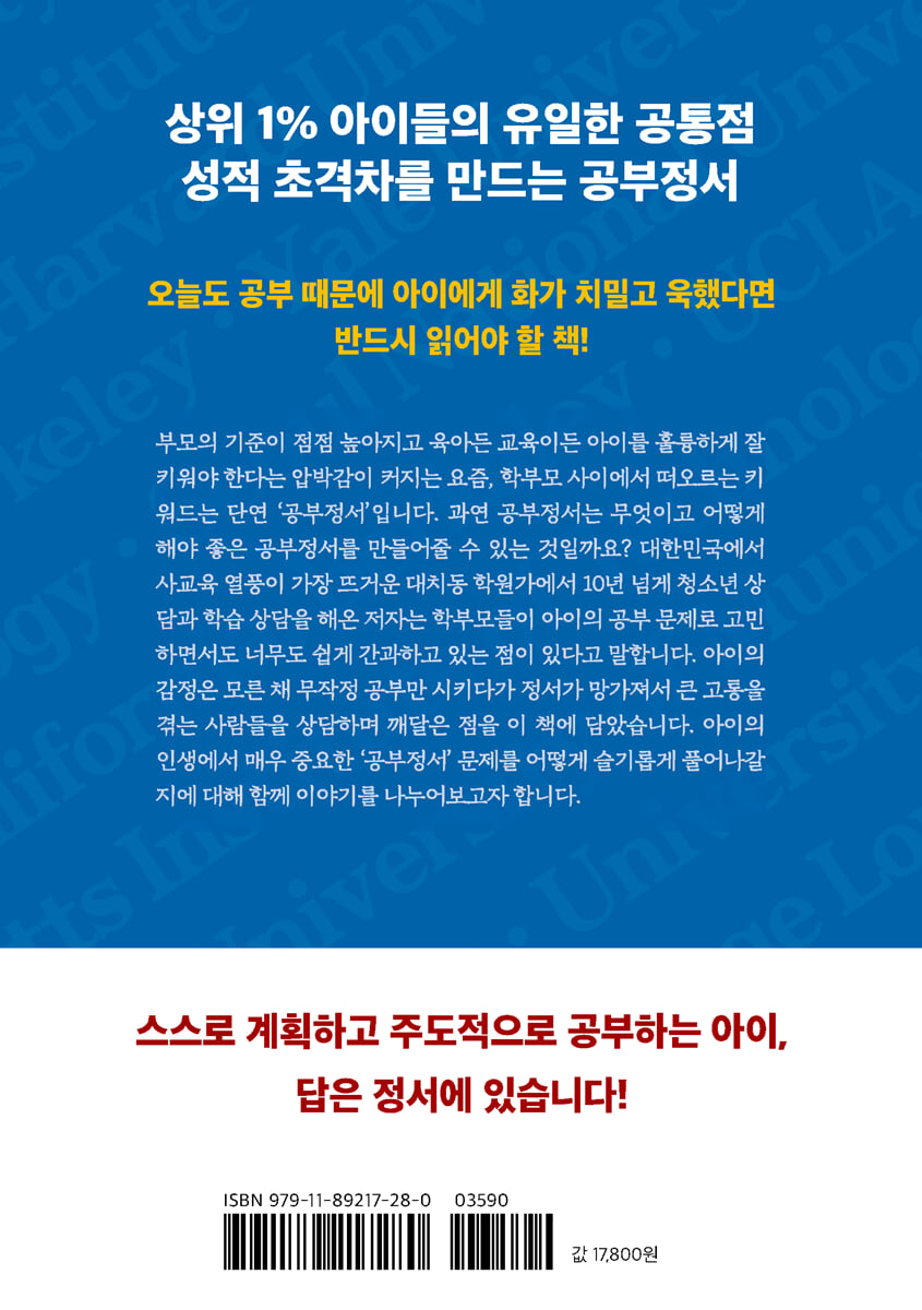 ---「망치지만 말자」중에서 이때 놓치지 말아야 하는 게 하나 있습니다. 아이가 경험하는 감정은 생각보다 깊고 넓고 아프고 오래 간다는 점이에요. 나의 말 한마디, 스치듯 지은 표정, 사소한 감정이 아이에게 큰 영향을 끼칠 수 있어요. 특히 부정적인 감정은 더 오래 남습니다. 하지만 부모도 인간인데 어떻게 늘 좋은 감정만 보이고 좋은 말만 하겠어요? 좋은 모습만 보이려고 하는 것보다는 ‘내가 최악의 이야기를 하고 있는 건 아닌가?’ 하고 스스로 점검하는 게 훨씬 더 낫습니다. ---「구구단 트라우마」중에서 엄마들은 대개 부정적인 정서에 대해서 걱정하는데요. 그것을 빨리 억압해서 없애려고 하는 게 아니라 이 정서를 아이가 있는 그대로 잘 받아들이고 이해하고 수용하는 식으로 해소해야 합니다. 그 방법으로 가장 중요한 것은 자신을 믿어주는 사람한테 표현하고 수용받는 것입니다. 그런 경험을 많이 해봐야 앞으로 살면서 찾아올 수많은 다양한 정서들을 아이가 스스로 조절할 수 있는 힘이 생겨요. ---「공부정서가 망가질 때 나타나는 증상」중에서 아이의 애착 욕구를 충족시켜주고 사랑을 주는 존재, 든든한 버팀목 같은 엄마가 되시기 바랍니다. 또 자율성을 충족시켜주고 아이의 마음을 있는 그대로 존중해주고 인정해주시기 바랍니다. 이 두 가지를 계속하는 게 부모의 가장 중요한 역할이며 그것이 아이의 정서를 안정되게 만듭니다. 안정된 정서는 공부와 밀접한 관련이 있습니다. ---「내적 동기를 일으키는 요인」중에서 정서는 의도적으로 어떤 상황에서 반복된 감정을 부여하는 게 아니라 이미 아이가 가지고 있는 거예요. 이미 아이에게 있는 정서가 그 순간에 나타난 것뿐이죠. 그래서 엄마는 공부를 시키는 순간순간마다 아이가 어떻게 반응하는지 잘 살펴보고 대응해야 합니다. 무조건 긍정적인 정서를 심어줘야 한다는 개념을 버리셔야 해요. 정서에는 우열이 없습니다. 가장 좋은 정서, 가장 나쁜 정서 이런 게 없다는 말입니다. ---「좋은 공부정서를 만드는 법」중에서 사실 그 상황에서 분노하지 않고 협박의 말을 안 하는 것도 분명 어려운 일입니다. 알아도 잘 안 돼요. 그래도 이렇게 말씀드리는 이유는 머리로라도 알고 있는 것이 아예 모르고 있는 것보다는 훨씬 낫기 때문이에요. 아이의 자율성이 훼손됐을 때 수치심이 찾아오고 수치심의 표현형은 분노라는 것, 아이의 이면에서는 마음이 이렇게 작동하고 있음을 꼭 기억해주세요. 아이가 화내는 행동에 집중하지 말고 이면에 있는 감정에 집중해주세요. ---「좋은 공부정서를 만드는 법」중에서 엄마에게는 모두 아이를 잘 교육해야 하고 훈육해야 한다는 압박감이 있어요. 아이의 버릇을 잘 들여야 하고 가정교육을 잘 받아서 인성이 좋다는 말을 들어야 한다는 생각도 있습니다. 이런 불안이 크기 때문에 아이한테 도움이 될 말을 해야 한다고 생각해서 긍정적인 영향을 미치고자 말을 잘하고 싶어집니다. 그래서 책도 읽고 말 잘하는 엄마를 굉장히 부러워하기도 해요. 그런데 중요한 것은 ‘어떻게 말을 잘할까’가 아니라 ‘어떻게 말을 잘 들을까’입니다. ---「정서적 대화법 1 - 아무 말 안 하기」중에서 논리가 아닌 정서를 다루는 대화를 해야 합니다. 아이와 대화할 때 논리를 내세우는 건 치사한 겁니다. 불공평한 경쟁이고 오히려 아이의 정서를 부정적으로 만드는 지름길입니다. ---「정서적 대화법 2 - 말하고 싶게 하기」중에서 감정이 해소될 뿐 아니라 다음 단계로도 갈 수 있게 됩니다. 아이도 점점 생각을 하게 돼요. 자연스러운 감정을 엄마에게 표현해봤더니 뭔가를 깨닫게 됩니다. 자기의 감정이나 정서나 또는 생각의 흐름과 그 패턴을 점점 알게 돼요. 이거는 하나하나 가르쳐줘서 알게 되는 게 아니에요. 이런 자기에 대한 통찰은 계속 반복적으로 자기의 생각과 감정을 말해보는 경험을 통해서 인식되는 거예요. ---「정서적 대화법 2 - 말하고 싶게 하기」중에서 정서를 잘 다루었으면 결과적으로 어떻게 하면 공부를 시킬 것인지에 대해 궁금해하실 것 같습니다. 지금 그렇게 생각하셨다면 대화의 목적이 업무라고 보신 겁니다. 일 처리로 본 거죠. 대화의 목적은 그게 아니에요. 좀 돌아가는 것 같아도 정서적 관계를 놓치지 않아야 숙제시키기도 잘 돼요. 숙제시키는 건 정서적 관계를 잘 쌓는다면 결국은 해결되거든요. 그래서 관계를 쌓는 게 중요한 거예요. 그러기 위해서는 이보 전진을 위해서 일보 후퇴를 해야 합니다. ‘내가 이렇게 얘기 잘 들어줬으니까 이제 엄마 말 잘 듣겠지.’ 이런 마음을 내려놓아야 하고 성급하게 결론으로 이끌지 않아야 합니다. ---「정서적 대화법 3 - 결론 내지 않기」중에서 물론 아이의 정서 회복은 단기간에 이루어지지 않습니다. 여기서 또 조급해하시면 안 됩니다. 최소한 1~2년 이상의 긴 시점을 가지고 아이의 정서와 행동을 함께 살펴보아야 합니다. 정서를 받아주는 것은 아이의 정서적 코어를 강화하는 것과 같습니다. 꾸준히 정서적 교감을 유지하면서 아이의 정서를 회복시켜야 합니다. 이러한 과정에서 부모와 아이 모두가 성장할 수 있습니다. 이제부터는 공