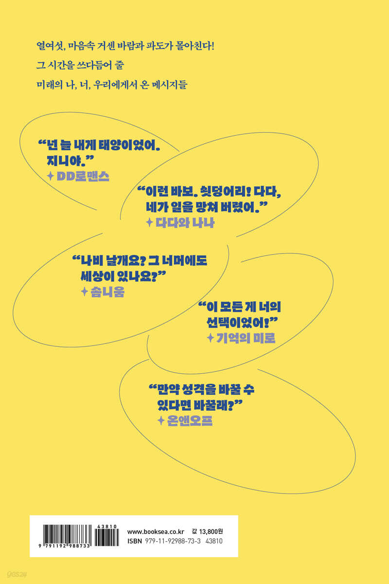 _〈DD로맨스〉 항상 이성적이고 논리적인 항두와 감성적인 지니는, 서로 다른 성격만큼이나 자주 티격태격하지만 절친한 친구다. 항두가 빅데이터와 유전자 기반 데이트 앱‘DD로맨스’를 통해 커플 성공 확률 95퍼센트나 일치하는 여자친구를 소개받기로 했다는 소식을 들은 지니는 이상한 감정에 휩싸이고, 항두의 뒤를 캐기 시작한다. 지니와 항두는 진짜 인연을 만날 수 있을까? “이런 바보. 쇳덩어리! 다다, 네가 일을 망쳐 버렸어.” _〈다다와 나나〉 나나와 일상을 공유하는 안드로이드 로봇 ‘다다’는 어느 날 나나 대신 어릴 적 친구 지훈을 만나게 된다. 나나의 옛 기억을 떠올리며 만남을 이어가던 중, 다다는 지훈에게 평소 나나가 꼭꼭 숨겨 놓고 하지 못했던 말들을 지훈에게 하게 된다. 그 사실을 알게 된 나나는 다다에게 화를 내고 다다의 전원을 꺼 버리는데…. “나비 날개요? 그 너머에도 세상이 있나요?” _〈솜니움〉 하루에, ‘나비 날개’라 불리는 차단막이 열리는 4시간 만 해를 볼 수 있고, 그 시간 동안 산책을 통해 태양에너지를 모아 그 대가로 생존에 필요한 약과 영양제를 받을 수 있는 주거 구역. 그 구역에 사는 라온에게는 그 시간 동안 잠시 만나는‘솜니움’이라 부르는 작은 이끼 친구가 있다. 그런데 우연히 구역 너머에 솜니움보다 더 푸른, 다른 세상이 있다는 사실을 알게 된다. 그 세상을 찾아 떠나게 된 라온은 다시 돌아올 수 있을까? “이 모든 게 너의 선택이었어!” _〈기억의 미로〉 아빠와 단둘이 살고 있는 미로에게 낯선 남자가 찾아오는 일이 일어난다. 그 무렵 아빠의 알 수 없는 행동과 거짓말을 목격하게 되고, 자신 또한 알 수 없는 꿈과 환청에 시달린다. 그렇게 머릿속에서 들려오는 낯선 이름과 기억에 혼란스러워하던 미로는 어렵게 만난 한결이에게 충격적인 이야기를 듣게 된다. 미로는 소용돌이치는 기억 속에서 드러나는 진실을 감당할 수 있을까? “만약 성격을 바꿀 수 있다면 바꿀래?” _〈온앤오프〉 학교에서 괴롭힘을 당하는 진아는 자신의 소심하고 예민한 성격이 싫다. 어느 날 5년 만에 이모로부터 ‘사촌 수진이가 보고 싶어 하니 놀러 오라는’ 문자를 받는다. 그렇게 만난 수진이는 ‘온앤오프’라는 성격 개조 기계 덕분에 성격과 삶이 바뀌었다며 진아에게도 권하고, 진아 역시 온앤오프의 매력에 흠뻑 빠져든다. 그 후 진아는 의문스러운 사건에 휘말리게 되는데…. |
