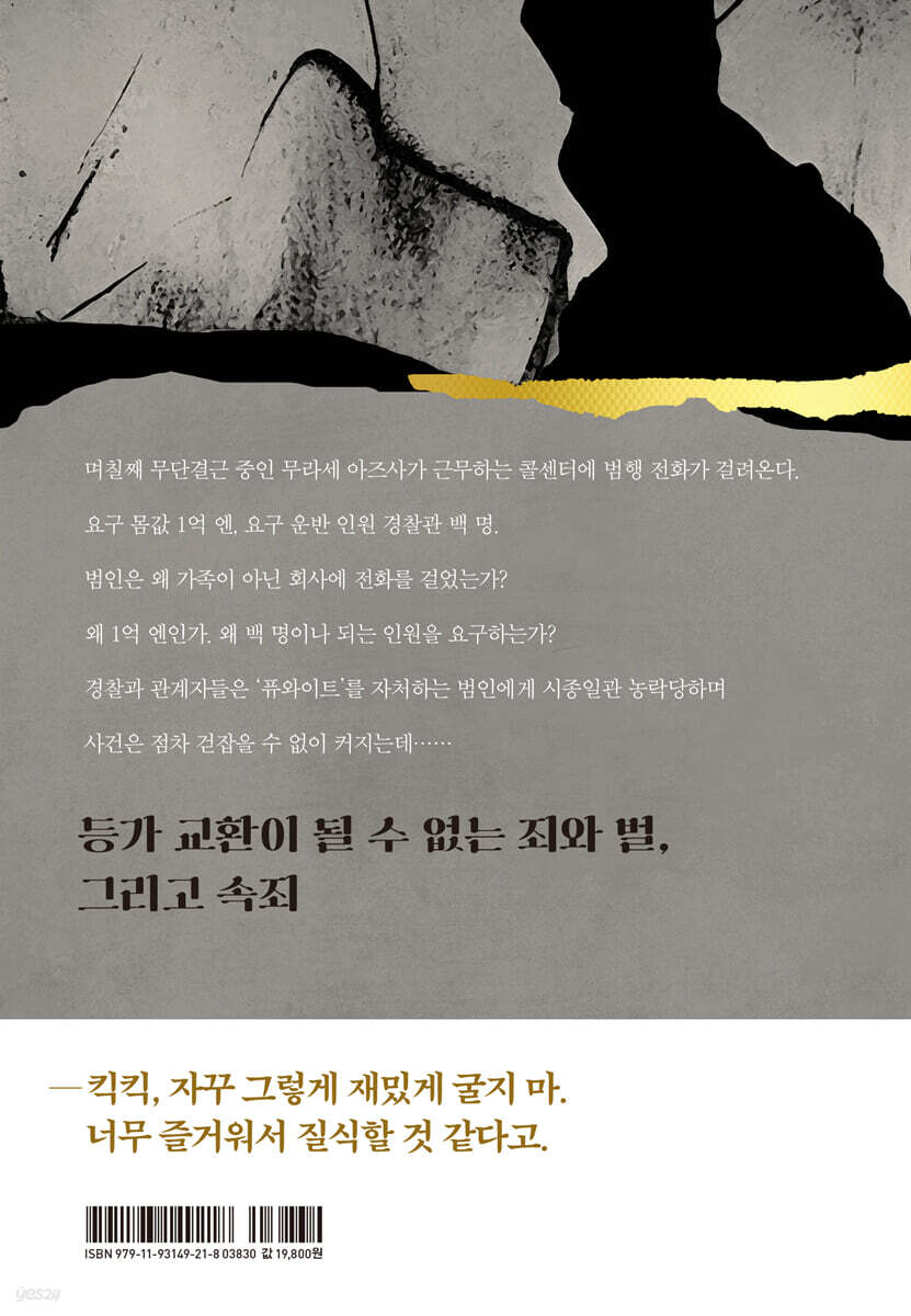 따르릉, 따르릉, 따르릉……. 마치 폭염 속 교통 체증을 견디지 못하는 경적 소리처럼 단 한 번의 짜증이 순식간에 퍼져 불쾌한 음악이 되어 흐른다. --- 첫 문장 오전 9시 업무 시작 후 거의 30분 만에 실내 한 층을 가득 메운 전화기 백여 대가 한꺼번에 채워졌다. 콜마스터 애플리케이션을 비추는 모니터로 시선을 향하자 그곳에 표시된 상담원들의 상태가 전부 ‘통화 중’으로 되어 있다. 옆 그래프에 있는 ‘콜 큐잉’*이라는 글자. 전화를 걸었지만 아직 연결되지 않은 ‘대기 중’ 전화가 화면을 넘어설 만큼 줄을 잇고 있다. --- p.8 오늘은 무슨 일로 전화를 주셨습니까?” -무라세 아즈사를 데리고 있어. 무심코 “네?” 하고 얼빠진 소리를 내고 말았다. -거짓말이 아니야. 지금 이 전화도 무라세 아즈사의 휴대폰으로 걸었으니까. 확인하면 금방 알 수 있겠지. 머릿속이 하얘졌다. 상대의 말이 귀에 들어오지 않는다. -다시 한번 말할게. 지금 난 무라세 아즈사를 데리고 있어. 그리고 이건 장난 같은 게 아니고 엄연한 영리 목적의 납치야. “자, 잠깐만.” -지금 당장 경찰에 신고하는 게 좋을걸. 그러지 않으면 무라세 아즈사는 죽게 될 거야. --- p.16 아즈미 마사히코, 마시로 노리히사, 무로토 쓰토무. 그해 여름까지 아무 인연도 접점도 없던 사람들이 서로 교차하며 모두의 인생이 궤도를 벗어났다. 얽히고설킨 실타래는 10년이 흐른 지금까지 이어져 이 자유롭지 못한 시간과 폭력으로 귀결되고 있다. 아니, 귀결인지 아닌지는 알 수 없다. To be continued. 자신 또는 상대의 죽음 외에 또 다른 끝이 있을까. --- p.23 모두가 아즈사를 버리면 퓨와이트는 어떻게 할 생각이었을까. 단순히 쾌락을 위해 범죄를 저지르는 쾌락범일까. 하지만 그러기에는 너무 공들이는 느낌이다. 나를 아는 녀석일까. --- p.81 침착해라. 상대 호흡을 읽어라. 상대가 뭘 원하고 뭘 원하지 않는지, 나는 뭘 할 수 있고 뭘 할 수 없는지. 냉정하게 전황을 파악하라. 그리고 최선을 다한 혼신의 일격을. --- p.142 이 녀석은 어쩌면 돈보다 백 명의 운반조가 모인 사실에 더 기뻐하고 있는 게 아닐까. 만약 정말 그랬다면. 그에게 돈보다 백 명의 인원을 모으는 것 자체가 더 중요했다면……. 납치극이 아즈미 마사히코의 가짜 연극이라면 돈 역시 그가 준비했으니 놀랄 것도 없다. 불확실한 운반조의 숫자가 궁금해지는 것도 이해가 간다. 하지만 애초에 왜 백 명이었을까. 왜 1억이었을까. --- p.264 “당신은 어떡하고 싶어? 나한테 뭘 기대하는 거야?” 펑, 펑, 펑. 하늘에서 불꽃이 터지고, 흩어졌다. “……널 죽일 사람은 나야.” --- p.355 인생은 계속된다. 밤하늘이 끝없이 펼쳐져 있다. 정적에도 변화라곤 없다. 가로등 불빛 주변을 날아다니는 날벌레들을 보고 있다. 내 할 일은 했다. 어설펐을지 모르지만 최선을 다했다. 부끄러워할 건 없다. 그런데도 이 개운치 못한 감정은 뭘까. --- p.433 “과거는 과거일 뿐입니다. 하지만 죽기 직전에는 과거가 전부죠. 최후의 순간에 돌아볼 과거가 허울투성이라면 전 그런 건 사절입니다.” 선배 형사의 생사관을 아소는 공유할 수 없을 것 같았다. 자신은 피할 수 없는 죽음을 눈앞에 두고도 분명 ‘아, 그렇군’이라고 중얼거릴 사람이기 때문이다. --- p.455 죄를 갚는 건 무엇을 의미할까. 용서란 무엇이며 그 끝은 어디에 있을까. 알 수 없는 일이다. 그러나 결코 물물교환은 아니다. “급하게 일어나시면 안 돼요.” 주의 사항을 지키며 천천히 슬리퍼에 발을 집어넣었다. 죽은 듯이 잠들어 있던 남자가 깨어났다. 지금은 화장실에 가고 싶고 배도 고프다. 루이를 만나서 꼭 안아 주고 싶다. --- p.581 |