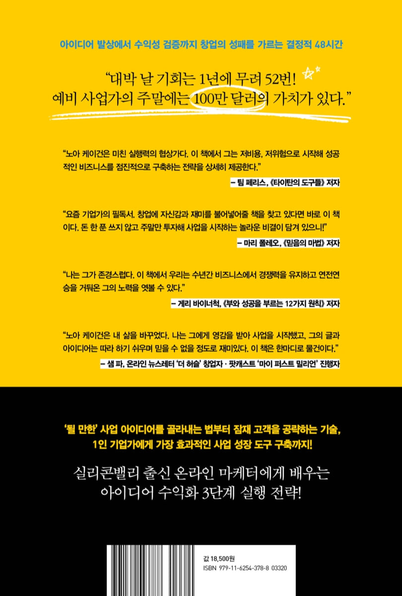 “48시간 안에 당신을 기업가 지망생에서 진짜 기업가로 바꿔주는 완벽한 책!” - 팻 고스텍 (유튜브 컨설턴트)