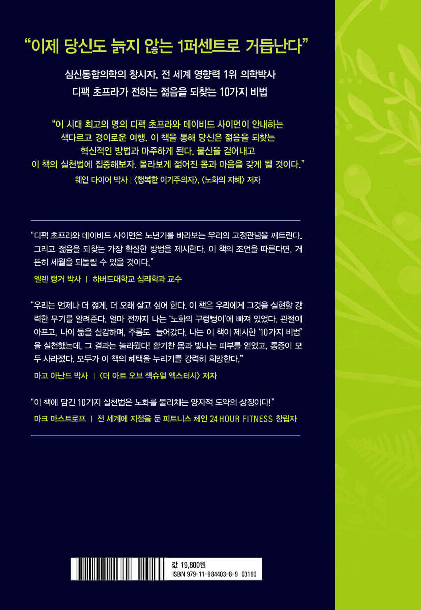 디팩 초프라와 데이비드 사이몬 박사는 이 책에서 '우리를 옭아매고 있는 노화에 대한 시선'을 깨버릴 강력한 정신력과 해법을 제시한다. 만약 당신이 이들의 조언을 제대로 따르기만 한다면 매우 빠른 시간 안(어쩌면 눈 깜짝할 사이)에 노화의 모든 부정적인 징후들을 날려버릴 수 있을 것이다. 또한 당신 스스로 더 이상 늙음을 두려워하지 않을 건강한 신체와 정신도 가질 수 있게 될 것이다. - 엘렌 랭거 (하버드 대학교 심리학과 교수)