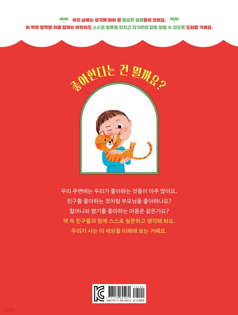 고양이를 좋아하는 것은 같은가요? 딸기와 초콜릿은 맛볼 수 있죠. 그런데 우리가 고양이나 할머니를 좋아한다면 딸기나 초콜릿처럼 맛이 있어서 좋아하는 건 아니에요. --- pp.6~7 친구들끼리 비밀 이야기를 하기도 해요. 그럴 때 드는 마음은 어떤가요? 그러다 한 친구가 다른 친구에게 그 비밀을 이야기해 버리면 우리는 화를 내고 다투게 되지요. 그러면 어떤 마음이 드나요? 좋아하는 친구가 있으면 손도 잡고 싶고 언제나 같이 있고 싶어요. 이런 때는 어떤 마음일까요? 그런데 좋아하는 친구가 다른 친구와 더 신나게 놀면 외톨이가 된 기분이 들기도 해요. 이때는 어떤 마음일까요? --- pp.22~23 친구를 좋아하는 것처럼 할아버지와 할머니를 좋아하나요? 왜 그렇게 생각하나요? 형제를 좋아하는 것처럼 부모님을 좋아하나요? 왜 그렇게 생각하나요? 우리는 연인이 서로를 사랑하는 것처럼 친구를 좋아하나요? 그건 왜 그런가요? --- pp.24~25 |