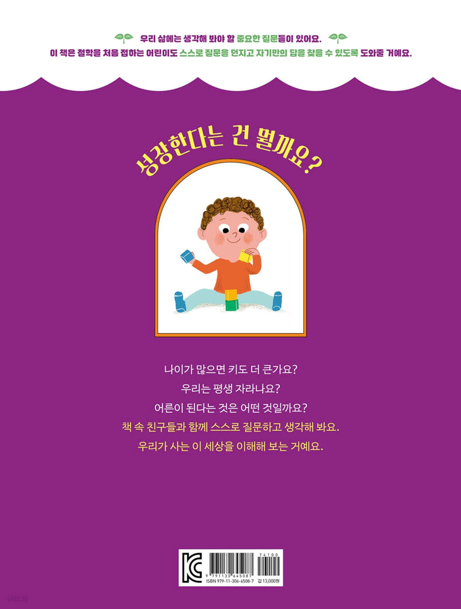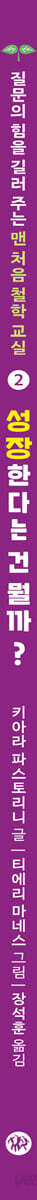 《맨 처음 철학 교실》시리즈의 두 번째 책은 〈성장한다는 건 뭘까?〉입니다. 이 책에서는 성장을 외적으로 커지는 것과 내적으로 성숙해지는 것으로 나누어 생각하고 있습니다. 그리고 그 안에서 다양한 해석을 내어놓고 있지요. ‘생각’에는 한 방향만 있는 것은 아닙니다. 책 내용 외에 또 어떤 성장이 있는지 여러 의견을 나누며 아이와 부모가 함께 더 질문하고 더 사유하는 시간을 가져 보세요. 책 뒷부분에는 조금 더 생각해 볼 수 있는 코너를 따로 마련하였습니다. 프랑스에서 철학을 전공한 장석훈 작가의 정성이 담긴 코너로, 어린이들이 스스로 답할 수 있도록 쉽고 재미있게 꾸며 놓았습니다. 읽은 내용을 정리하는 의미도 있지만, 더 많은 질문을 스스로 할 수 있는 힘을 기르는 의미도 담겨 있습니다. |