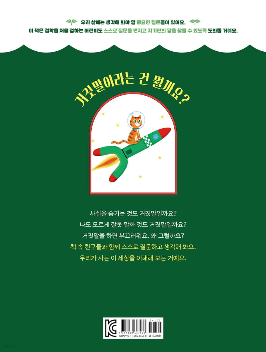 “로켓 이야기처럼 말이지?” 가스파르가 물어요. 거짓말은 사실과 다르게 말하는 건가요? 꾸며 내지 않고도 거짓말을 할 수 있을까요? “진짜라니까! 한번은 우리 고양이가 그 로켓에 올라타서….” “라파엘, 이제 그만 좀 해!” 아이샤가 말을 끊어요. “이야기를 하도 많이 지어내다 보니 너도 뭐가 진짠지 모르겠지? 결국 사람들은 더 이상 네 말을 믿지 않을 거야.” 가스파르가 딱 잘라 말해요. 자기 자신도 속일 수 있을까요? 자신을 속이는 건 남을 속이는 것과 같은가요? 다른 사람을 속이면 서로에 대한 믿음이 깨질까요? --- pp.8~9 “난 혼날까 봐 무서울 때 거짓말을 하게 돼. 그럼 혼나지 않고 넘어갈 수 있잖아.” 가스파르가 말해요. “맞아. 너는 코와 뺨에 초콜릿을 잔뜩 묻히고 다른 사람이 초콜릿을 먹었다고 했던 애지!” 혼날까 봐 두려워서 거짓말하는 것은 괜찮은가요? --- pp.10~11 “거짓말이 필요할 때도 있어!” “언제?” 가스파르가 놀라서 묻자, 아이샤가 답해요. “다른 사람의 마음을 상하게 하고 싶지 않을 때 말이야. 우리 엄마가 머리카락을 짧게 자르고 왔을 때 기억나? 엄마는 아주 마음에 들어하셨거든. 나는 별로라고 생각했지만 그렇게 말할 수 없었어. 그랬다간 엄마 기분이 상했을 거야. 그래서 나도 마음에 든다고 거짓말했지.” 다른 사람을 기쁘게 해 주려고 거짓말을 할 수 있나요? 다른 사람을 위해서 거짓말을 하는 건 괜찮은가요? “나는 동생을 감싸느라 거짓말을 한 적이 있어.” 라파엘도 말을 보태요. “동생 루이즈가 말썽을 부렸을 때, 동생이 혼나지 않게 부모님께 거짓말을 했어.” 어쩔 수 없이 해야 하는 거짓말이 있을까요? --- pp.22~23 |
