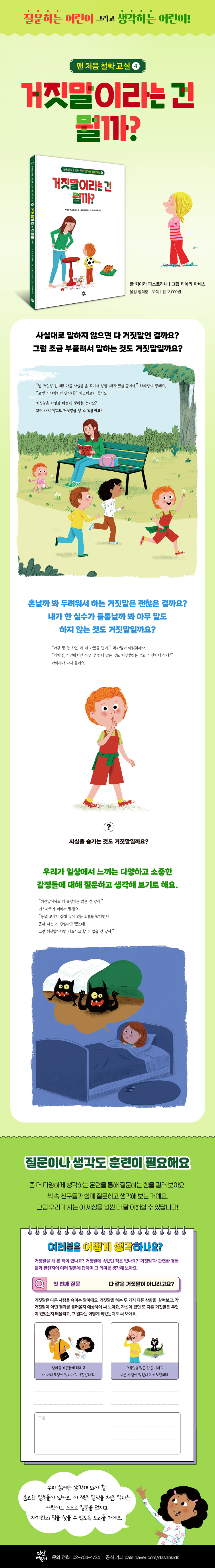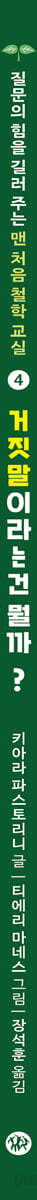 《맨 처음 철학 교실》시리즈의 네 번째 책은 〈거짓말이라는 건 뭘까?〉입니다. 이 책에서는 거짓말을 하는 다양한 상황을 설정하고 그에 대해 고찰해 각자의 의견을 묻고 있습니다. 그리고 그 안에서 다양한 해석을 내어놓고 있지요. ‘생각’에는 한 방향만 있는 것은 아닙니다. 아이의 경험을 바탕으로 거짓말에 대해 여러 의견을 나누며 아이와 부모가 함께 더 질문하고 더 사유하는 시간을 가져 보세요. 책 뒷부분에는 조금 더 생각해 볼 수 있는 코너를 따로 마련하였습니다. 프랑스에서 철학을 전공한 장석훈 작가의 정성이 담긴 코너로, 어린이들이 스스로 답할 수 있도록 쉽고 재미있게 꾸며 놓았습니다. 읽은 내용을 정리하는 의미도 있지만, 더 많은 질문을 스스로 할 수 있는 힘을 기르는 의미도 담겨 있습니다. |