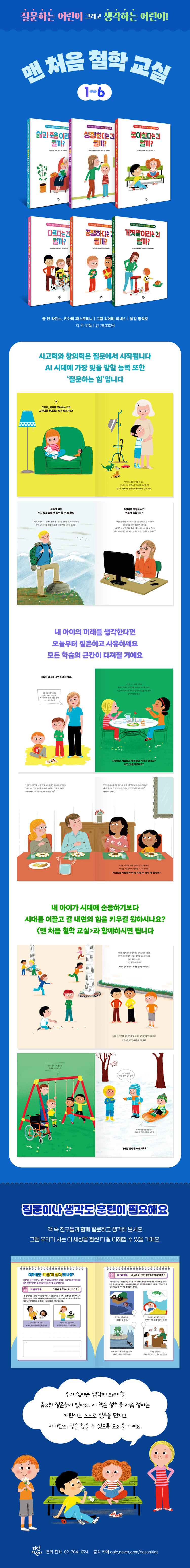 《맨 처음 철학 교실》 시리즈는 우리가 자칫 잃고 있는지도 모를 ‘생각의 힘’을 키워 주는 책입니다. 그 방법으로 ‘질문’을 택했고요. 책 속의 여러 주인공들이 던지는 다양한 질문에 답하다 보면 우리 아이들은 내가 모르고 있는 부분이나 자신 있게 이야기할 수 있는 부분을 인지하게 됩니다. 그리고 같은 질문이라도 연령에 따라 답은 다양해지고 사유의 폭은 넓어질 거예요.