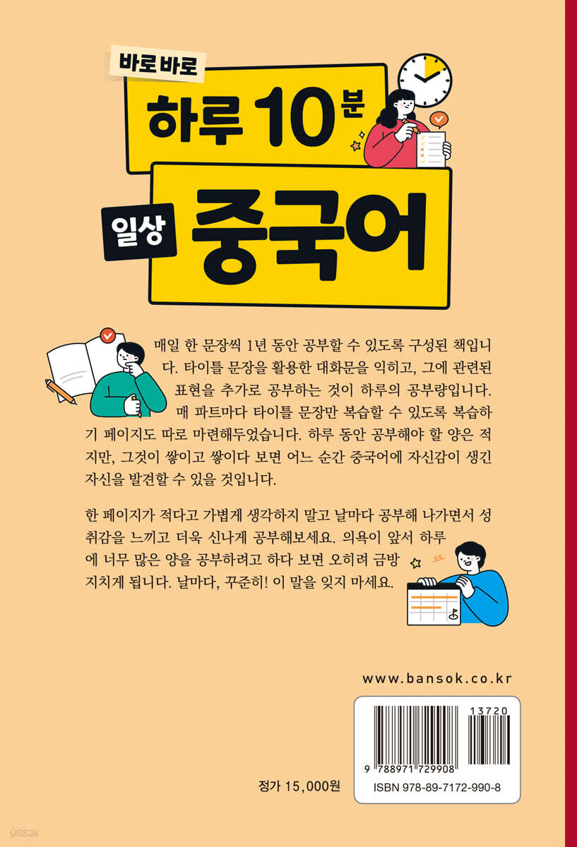 무슨 일이든 마찬가지겠지만 특히 언어에 있어서는 꾸준히 하는 것이 가장 중요합니다. 감을 잃지 않는 노력이 필요합니다. ‘매일 한 문장씩 1년 동안 365개 문장을 공부하면 중국어를 잘할 수 있게 되지 않을까’라는 기획 아래 본 교재를 집필하게 되었습니다. 학습자의 입장에서 하루하루 유용한 표현들을 익히면서 성취감을 느낄 수 있도록 동기부여를 하는 데에 중점을 두었습니다. 본 교재는 매일 주요 표현을 소개하고, 대화문을 통하여 어떻게 활용하는지에 대해 제시하였고, 관련된 표현을 통해 주요표현과 비슷하거나 관련된 표현을 익힐 수 있도록 하였습니다. 또한 연습문제를 통해 다시 복습할 수 있도록 하였습니다. 제가 중국어 공부를 처음 시작했던 1991년을 떠올려봅니다. 그때만 해도 학습자에 맞는 교재가 많지 않아 교재를 선택하기가 어려웠다면, 지금은 교재가 너무 많아서 교재를 선택하기가 어렵습니다. 저는 최대한 학습자의 입장에서 교재를 집필하려 노력하였습니다. 본 교재가 많은 독자분들의 중국어 학습에 도움이 되었으면 좋겠습니다. 이 책의 특징 및 활용방법 『바로바로 하루 10분 일상 중국어』는 매일 하나의 문장을 익히면서 관련된 표현도 함께 학습할 수 있도록 구성하였습니다. ① 오늘의 문장 매일 하루 유용한 표현을 배울 수 있습니다. 딱딱한 문어체 문장이 아닌 실생활에서 바로 활용할 수 있는 실용적이고 가벼운 표현들을 날마다 익혀보세요. ② 대화 대화문을 통해 주요표현을 활용할 수 있습니다. 중국어와 한글이 나란히 배열되어 있어 중국어를 가리고 한글만 보며 학습해 보거나 중국어를 보고 바로 옆의 뜻을 보면서 익히는 등의 학습이 가능합니다. ③ 단어 표현이나 대화문을 통해 새로운 단어를 익힙니다. ④ 관련 표현 주요표현과 비슷한 관련된 표현을 제시하여 익힐 수 있도록 했습니다. ⑤ TIP 회화 표현 학습에 도움이 되는 팁을 수록하였습니다. |