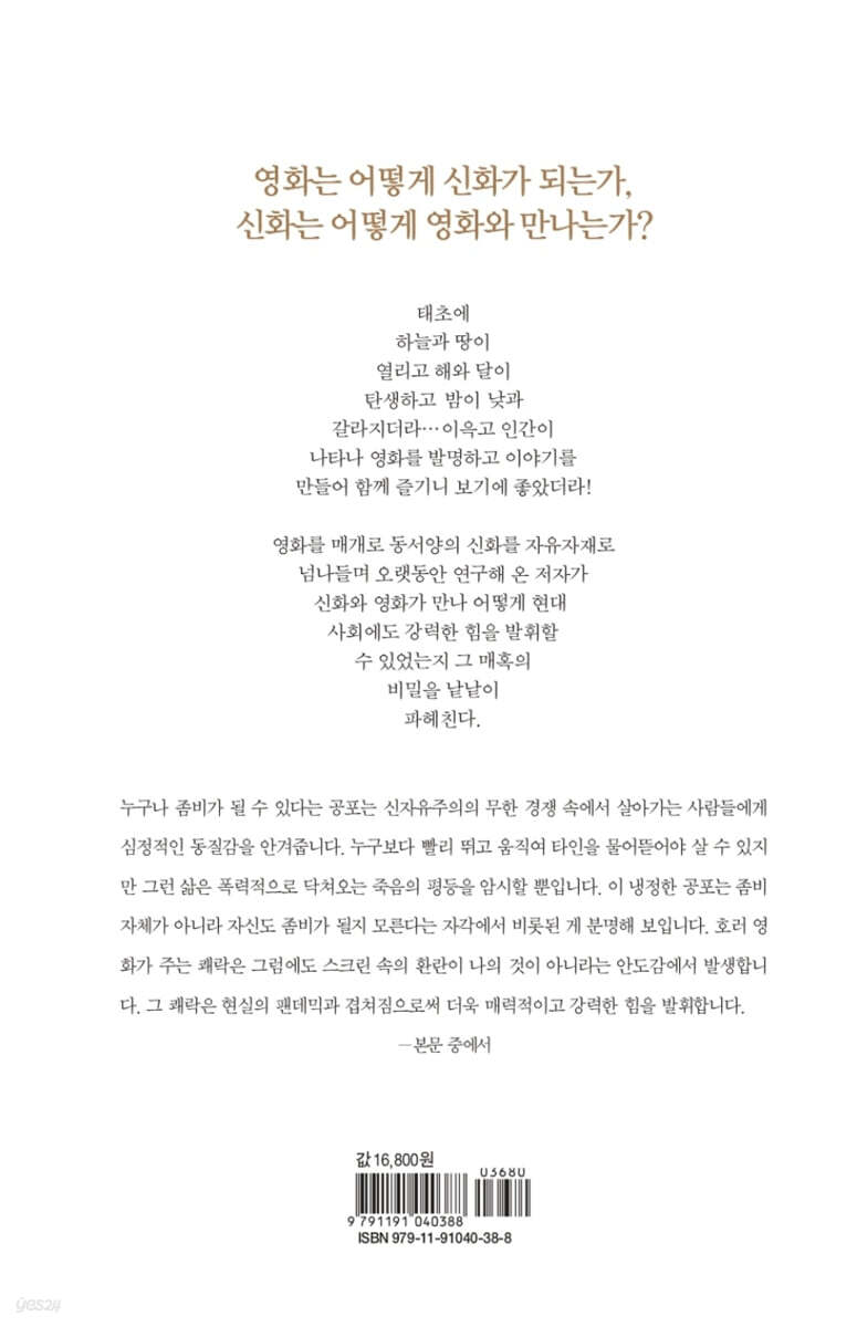 1. 너의 운명을 사랑하라 · [그을린 사랑] 이오카스테의 운명을 받다 오이디푸스 신화를 변주한 영화들 2. 네 기쁨에 이른 너를, 나는 봅니다 · [타오르는 여인의 초상] 오르페우스와 에우리디케의 사랑 우리는 언제, 왜 돌아보는가? 3. 크리스마스의 목베기 게임 · [그린나이트] 아더 왕 전설과 켈트 신화 녹색 기사의 상징과 의미 4. 신화의 폭력성 · [미드소마] 한여름 낮에 펼쳐지는 오컬트 민속 호러 북유럽 신화의 두 계보 5. 할리우드의 신화 지우기 · [트로이] 그리스/로마 신화? 트로이 전쟁의 서막 할리우드의 신화 다시 쓰기 6. 과연 정의란 무엇인가? · [킬링 디어] 아울리스의 이피게네이아 신성한 사슴 죽이기 신화의 계산법 과연 정의란 무엇인가? 7. 여신으로 등극한 엘사 여왕 · [겨울왕국 2] 북유럽 신화의 서사 공간 4원소의 정령 순록 유목민 사미족과 요이크 공주가 아닌 여왕, 여왕도 아닌 여신 8. 뱀파이어 에로스 · [드라큘라] 코폴라 감독의 정통 흡혈귀 영화 피의 판타지와 에로티시즘 9. 인어와 사랑에 빠지다 · [셰이프 오브 워터] 물과 관련된 이류연애담 경계를 넘나드는 존재들 차별과 편견을 뛰어넘는 연대 10. 도플갱어와 홍콩 느와르 · [무간도] 인간의 이중성을 탐구하다 홍콩 느와르와 무간도 시리즈 11. 바람이 불고, 사쿠라가 지다 · [바람이 분다] 아름답지만 저주받은 꿈, 비행기 ‘지는 사쿠라’ 모노노아와레 판단하지 않는 삶이 불러온 악 바람이 분다, 살아야겠다 12. 다시 돌아온 신화, 미야자키 하야오 · [그대들은 어떻게 살 것인가] 분열된 모성 트라우마 아주 작은 조각들의 세상 악의를 갖지 않는 자, 펠리컨의 변명 원작과 각본 · 미야자키 감독의 진정한 은퇴작 13. 합체 · 변신 · 진화하는 몬스터 · [포켓몬스터] 메타모포시스 영원불멸의 포켓몬? 심야괴담회 햐쿠모노가타리 요괴 이미지의 생성원리 14. 한국 괴수 영화 연대기 · [대괴수 용가리]와 [우주괴인 왕마귀] 용가리 VS. 왕마귀 문제적 ‘불가사리’ OTT 드라마 속 괴물들 15. 유동하는 좀비 공포 · [부산행] 좀비 영화의 시작 천만 관객의 한국형 좀비 영화 16. 범의 허리에서 여우의 쇠침을 뽑다 · [파묘] 함께 먹는 행위 여우 음양사 독립운동가의 이름 |
