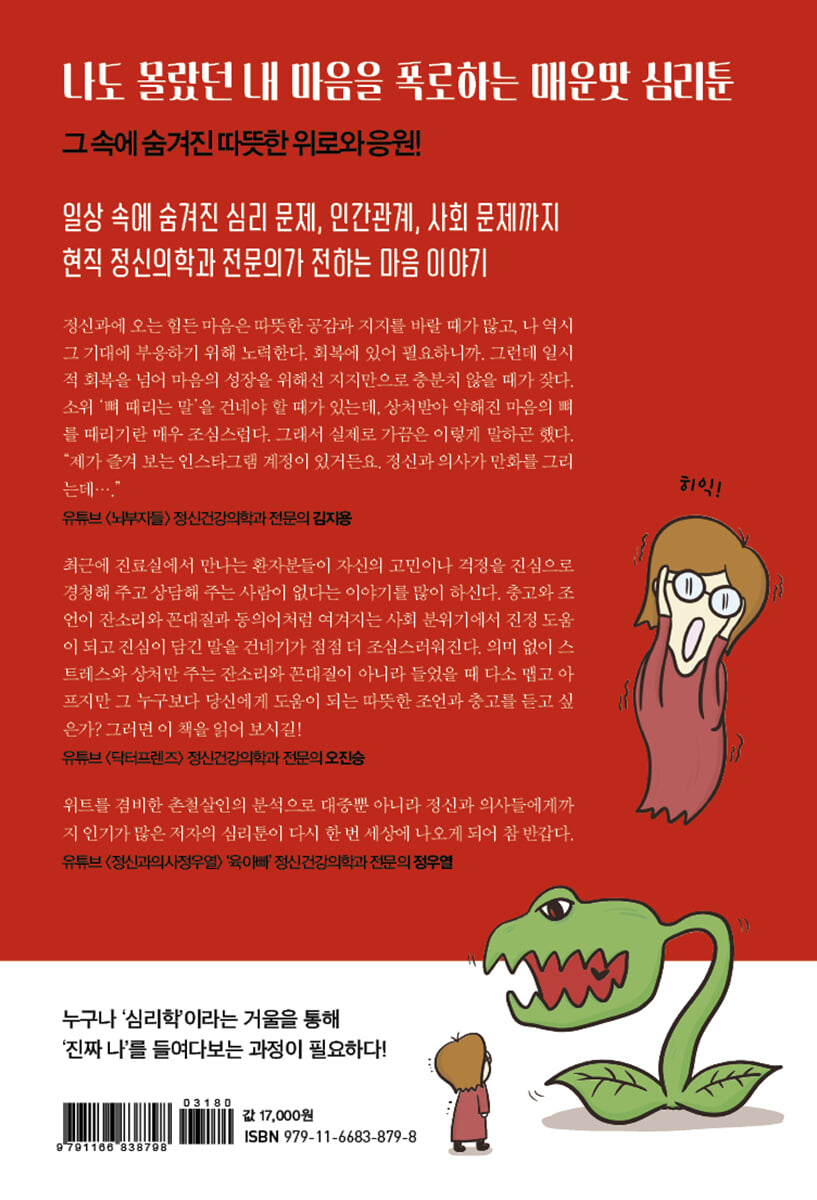 위트를 겸비한 촌철살인의 분석으로 대중뿐 아니라 정신과 의사들에게까지 인기가 많은 저자의 심리툰이 다시 한 번 세상에 나오게 되어 참 반갑다. - 정우열 (유튜브 <정신과의사정우열> ‘육아빠’ 정신건강의학과 전문의)