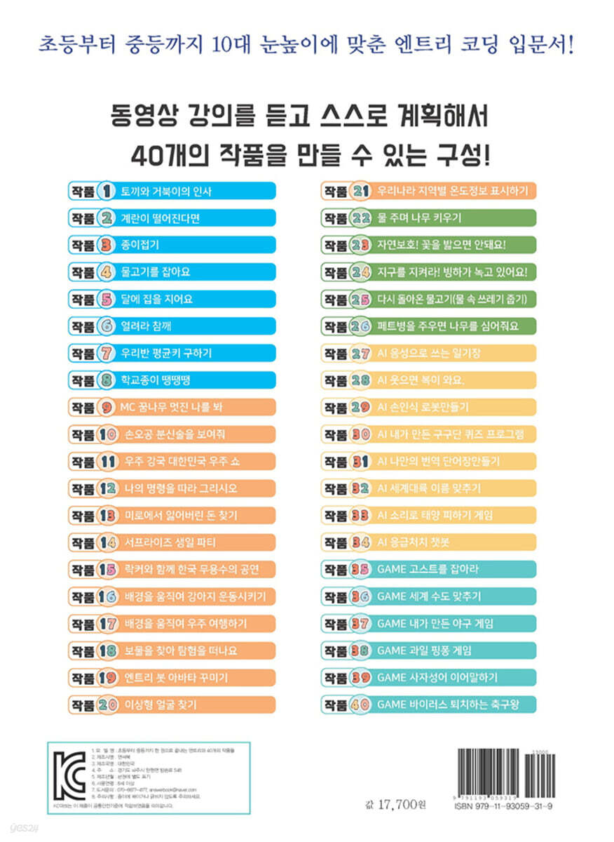 프로그래밍 개념을 이해하고 -〉 동영상 강의 듣고 -〉 스스로 계획해서 -〉 직접 코딩 -〉 작품 만들기! 이 책은 이런 분께 강력 추천 드린다. - 동영상 강의보며 스스로 계획해서 코딩 공부하고 싶은 초등학생, 중학생 - 다양한 작품으로 학교/학원/방과 후 코딩 교육 교재를 원하는 교강사 - 아이에게 상상력, 수학적 사고력, 창의력을 가르치고 싶은 초중등 선생님 - 소프트웨어 활용 능력과 문제해결 능력을 키워주고 싶은 초중등 학부모님 - 초중등 SW 코딩, 블록 코딩을 활용한 프로젝트에 관심있는 분 친절한 동영상 강의 전 과정 완전 무료 제공! - 40개 전체 작품의 전 과정에 대한 아주 친절한 저자의 동영상 강의를 모두 무료로 제공한다. 저자가 직접 답변해 주는 이 책의 전용 게시판 운영한다. 책 소스와 책 전용 게시판 관련한 내용은 이 책의 4~5쪽을 참고한다. Part 00 엔트리와 인공지능 기초 엔트리 개념, 기능과 인공지능 등 기초 지식에 대해서 알아본다. Part 01 코딩! 어렵지 않아 프로그래밍의 알고리즘 구조와 기초 관련 8개 작품을 만들어본다. Part 02 코딩 날개달기 코딩 활용 방법을 통해 흥미와 자신감을 얻을 수 있는 13개 작품을 만들어본다. Part 03 더 나은 세상을 위한 코딩 함께 더블어 행복한 세상을 만들기 위한 고민을 할 수 있는 5개 작품을 만들어본다. Part 04 나를 위한 인공지능 인공지능을 활용한 코딩을 경험해 볼 수 있는 8개 작품을 만들어본다. Part 05 사고력UP 자기주도 게임 만들기 다양한 게임을 만들어 체험해 볼 수 있는 6개 작품을 만들어본다. |