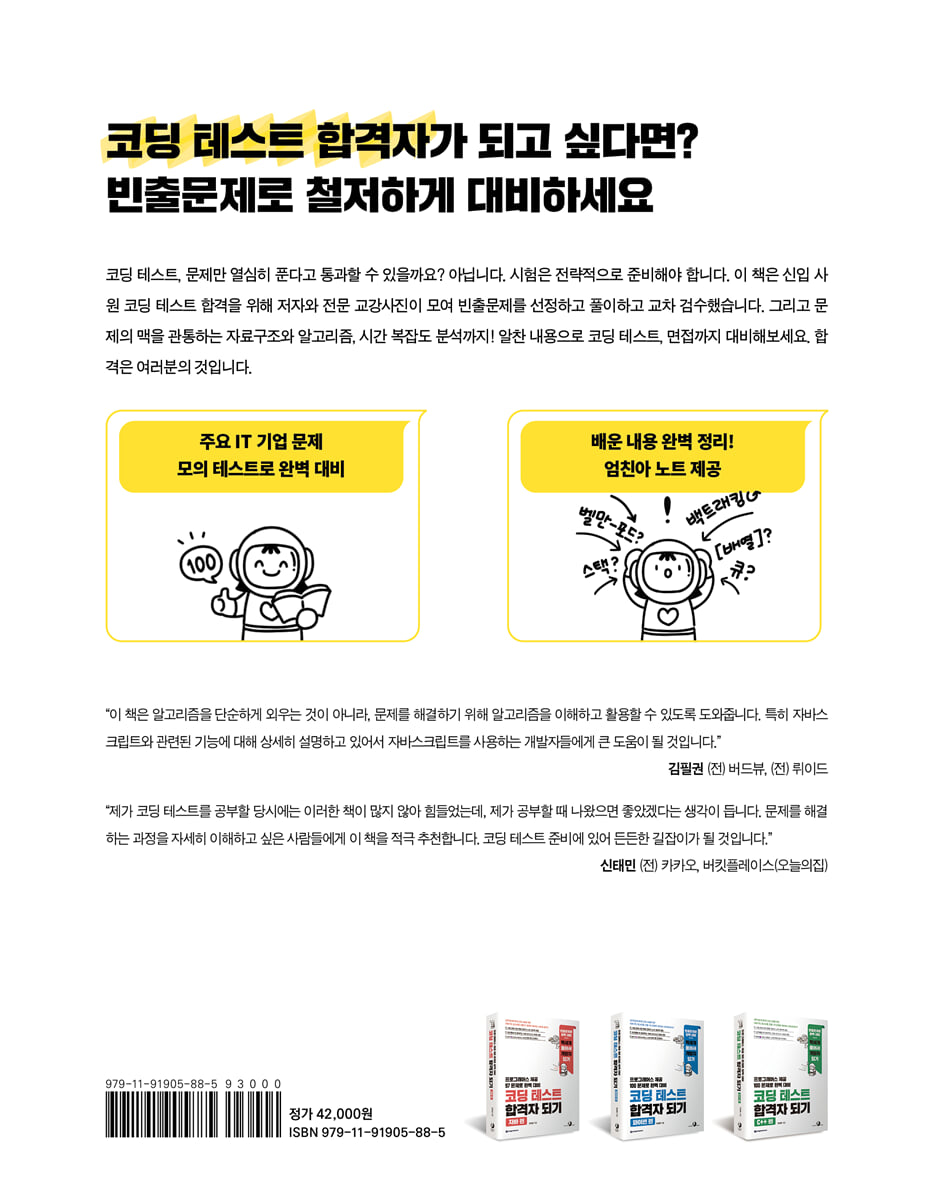 제가 코딩 테스트를 공부할 당시에는 이러한 책이 많지 않아 힘들었는데, 요즘에는 비슷한 책들이 많아지고 있는 것 같아 기쁘기도 하고 제가 공부할 때 나왔으면 좋았겠다는 생각도 듭니다. 코딩으로 문제를 해결하는 과정을 자세히 이해하고 싶은 사람들에게 이 책을 적극 추천합니다. 이 책은 코딩 테스트 준비에 있어 든든한 길잡이가 될 것입니다. - 신태민 ((전) 카카오, 버킷플레이스(오늘의집)) |