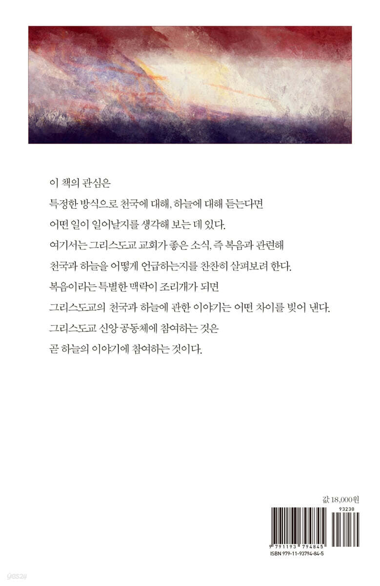 '천국’heaven이라는 주제에 관심이 있다고 해서 반드시 특정 신앙 공동체에 들어갈 필요는 없다. 세속 집단이든 신앙 공동체이 든 어디에 속하느냐에 따라 천국에 대한 인상은 천차만별이다. “천국”이라는 말을 들으면 사람들은 특정 모습을 떠올리곤 한 다. 물리적인 하늘sky을 떠올리기도 하고, 죽음 이후의 삶으로 이해하기도 하고, 지복의 상태라 여기기도 한다. 그리고 이 연장선 에서 천국을 믿는다고도, 믿지 않는다고도 말한다. 이 책의 목적은 천국과 하늘이라는 말에 대한 한 가지 생각만을 강요하는 데 있지 않다. 천국이라는 말이 어떻게 들리는지는 법으로 규정 할 수 없다. 또한, 이 책의 목적은 여러 전통을 두루 살펴서 절묘한 교집합을 찾으려는 데 있지 않다. 이러저러한 믿음의 논리나 불신의 논리가 널리 퍼져 있다 한들 별로 문제 될 건 없다. 어떤 공동체, 특정 공동체에 소속된 개인이라도 자유롭게 천국에 관한 질문을 던질 수 있다. 오히려 이 책의 관심은 누구든 특정한 방식으로 천국에 대해, 하늘에 대해 듣는다면 어떤 일이 일어날지를 생각해 보는 데 있다. 여기서는 그리스도교 교회가 좋은 소식, 즉 복음과 관련해 천국과 하늘을 어떻게 언급하는지를 찬찬히 살펴보려 한다. 또한, 이 책에서는 복음이라는 맥락에 맞추어 천국, 혹은 하늘과 관련된 성서 구절들을 읽으면 어떻게 될지 살펴보려 한다. 이 특별한 맥락이 조리개가 되면 그리스도교의 천국과 하늘에 관한 이야기는 어떤 차이를 빚어 낸다. 그리스도교 신앙 공동체에 참여하는 것은 곧 하늘의 이야기에 참여하는 것이다.