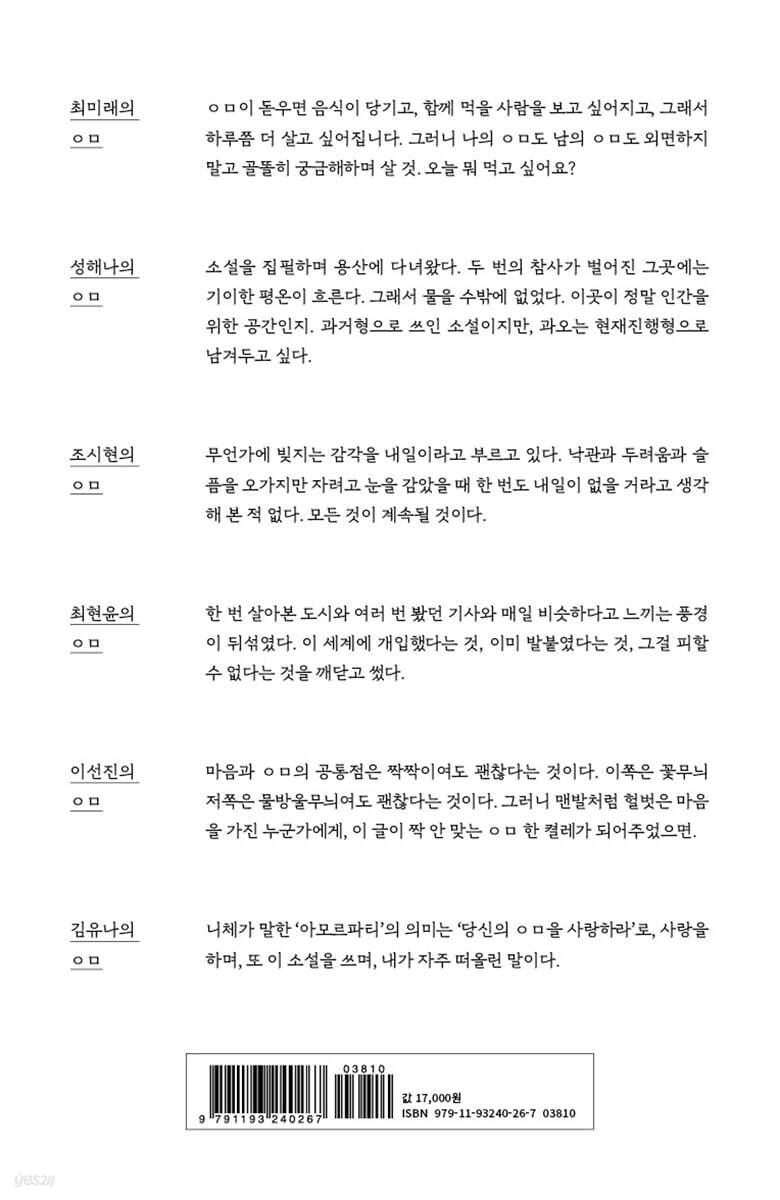 ‘ㅇㅁ’에서 시작한다는 느슨한 규칙 아래 모인 6명의 글은 제각각 다른 시선과 문제 의식을 가지고 저마다의 목소리를 낸다. 최미래 작가의 〈얕은 바다라면〉에는 서로의 결핍을 맞대고 한 시절을 지나온 연인과 자연스레 닮아갔던 ‘입맛’을 추억하는 인물이 있고, 성해나 작가의 〈구의 집: 갈월동 98번지〉에는 80년대 한국의 폐쇄적인 시대상 속 평범한 악인의 성실하고 묵묵한 ‘야만’이 있다. 조시현 작가의 〈파수破水〉는 주머니 속 작은 ‘올무’에서 시작해 결국 구멍 밖으로 역류하고 마는 일상 안에 돌출된 낯선 징조들을, 최현윤 작가의 〈너희 소식〉은 모든 것이 ‘이미’ 벌어지고 있는 “미친 세상”의 긴박함과 그곳에서 끝없이 갱신되는 얼굴들, 소식들, 장면들을 마주치는 한 개인의 무상함을 그린다. 이선진 작가의 〈볕과 끝〉에는 화창한 날들을 지나 한여름에 연인을 위해 두터운 ‘양말’을 뜨며 이별을 준비하는 뙤약볕 같은 사랑의 끝이, 뒤이어 오는 김유나 작가의 〈부부생활〉에는 안온한 얼굴로 범죄를 모의하고, “네가 나를 망하게 할 수 있다면 나도 너를 망하게 할 수 있다”는 사실에 안락함을 느끼며 꽉 쥔 손을 놓지 않는 사랑이 있다. 이토록 다르게 변주되는 소설의 끝에는 서로의 글에 보내는 코멘트가 있고 부록으로는 6인의 에세이와 ‘텔레스트레이션’ 게임을 변형한 ‘애매스트레이션’ 게임이 실려 있다. 둘러앉아 보드게임을 하는 친구들, 서로의 글을 나누어 읽고 다정한 감상을 보내는 동료들, 그럼에도 글을 쓸 때는 혼자가 되는 애매 동인의 면면을 한 권에 담았다. 문학동인 애매(愛枚) 애매(愛枚)의 뜻은 사랑 애(愛)에 낱 매(枚)를 써서 ‘우리가 써나간 글 한 쪽 한 쪽을 사랑하다’라는 뜻이지만, 대부분의 사람들은 우리를 ‘애매(曖昧)한 모임이라 애매구나’라고 합니다. 여섯 명의 동인 구성원이 각각 소설가, 시인, 출판인으로 이루어져 있기에 그렇지요. 소설의 결 또한 다양해 흔히 말하는 ‘○○파’라고 일컬어 명명할 수도 없습니다. 문학 또한 그런 애매함을 지향하는 게 아닐까요. 선(善)과 윤리의 기준에 대해, 단호한 규칙의 기이함에 대해, 연약한 것이 주는 강력한 힘에 대해. 정답이 없는 모든 것을 고민하고 질문하는 것이 문학의 일 중 하나이니까요. 누군가는 모임이 권력의 다른 말이라고 생각하기도 하고, 또 누군가는 문학은 혼자 하는 일이라고 말합니다. 모두 맞는 말입니다. 그래서 애매는 서로의 파수꾼인 동시에, ‘함께’하는 연대의 의미를 다져가며, 다양한 사람들과의 연결을 통해 글을 쓰고 책을 만들기를 지향합니다. 그렇게 세상의 한 쪽 한 쪽을 사랑하는 동시에, 영원히 애매(曖昧)한 모임으로 남을 수 있기를 바랍니다. |