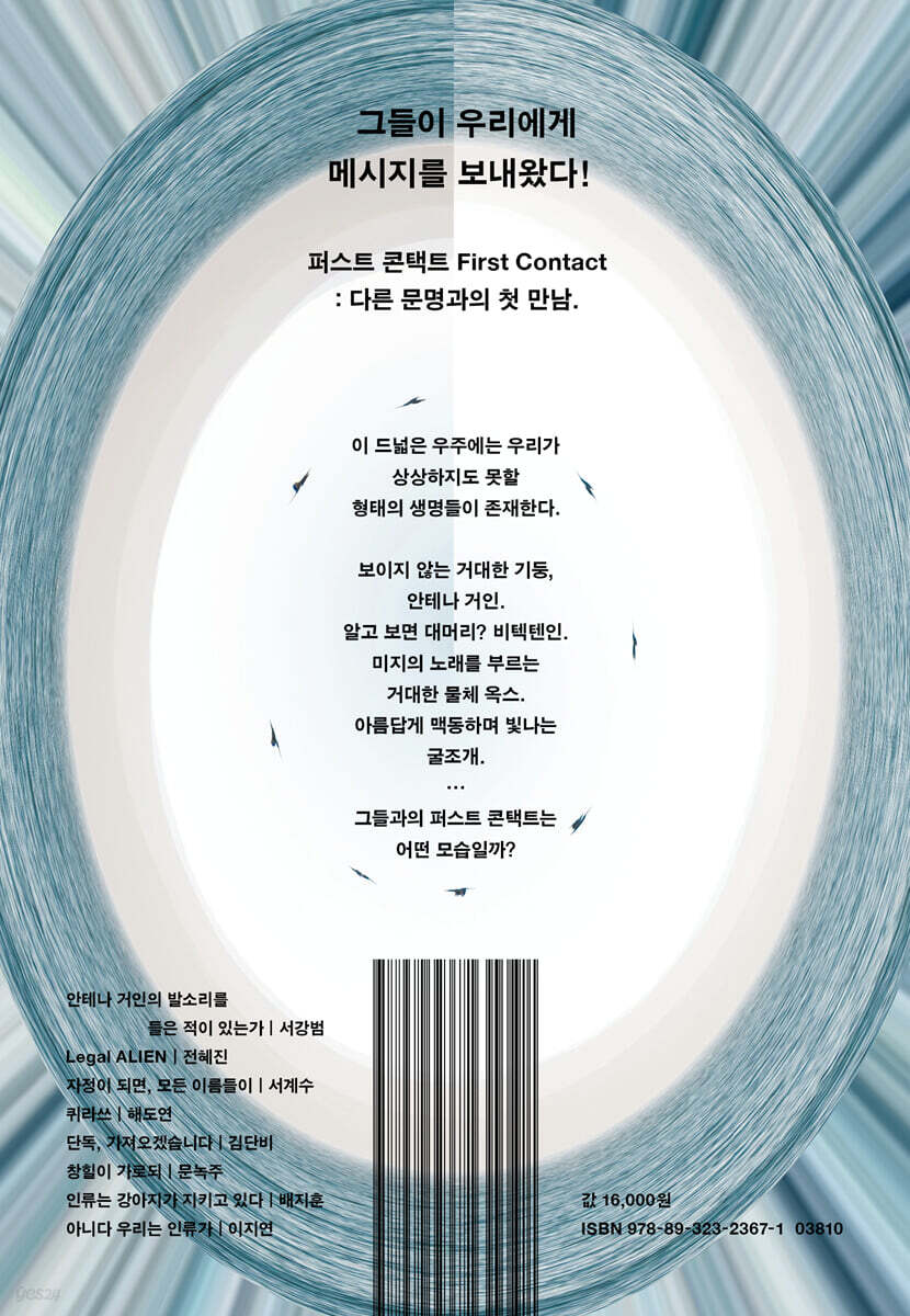파푸아 뉴기니 상공을 날아가던 비행기 두 대가 추락했다. 비행기는 무언가와 부딪쳤던 것으로 추정된다. 조사에 착수한 사람들은 보이지 않는 거대한 기둥의 존재를 알아낸다. 이 기둥은 살아 있고, 잠을 자고 있는 건지 알 수 없는 파장을 뿜어낸다. 이 파장은 사람들에게 영향을 끼쳐 근처에 있는 사람들이 모르는 언어를 할 수 있게 만들고, 내재된 폭력성을 건드려 살인을 저지르게 하기도 한다. 우주에서 온 것으로 추정되는 이 생명체는 ‘안테나 거인’이라고 불린다. 안테나 거인의 정체는 무엇일까? 8명의 작가가 그려내는 첫 만남의 이야기는 모두 제각각이다. 상상 속 외계의 존재 또한 모두 다양한 모습을 하고 있다. 투명하고 거대한 균체이기도 하고(「안테나 거인의 발소리를 들은 적이 있는가」, 서강범), 누군가의 잠꼬대로 만들어진 부산물이기도 하며(「자정이 되면, 모든 이름들이」, 서계수), 먼 옛날 전설 속의 괴물일 수도 있다(「창힐이 가로되」, 문녹주). 방문하겠다는 인사말을 미리 보내는 정중한 손님이기도 하지만(「Legal ALIEN」, 전혜진), 때로는 교통사고를 내놓고 제대로 사과하지 않는 뻔뻔한 뺑소니범이고(「인류는 강아지가 지키고 있다」, 배지훈), 인간에게 신경도 쓰지 않는 무심한 약탈자이기도 하다(「퀴라쓰」, 해도연). 이들은 인간이 감각하는 것과 다른 방식으로 존재하기에 연구자들도, 우주인들도, 교류하던 사람들도 정체를 이해하지 못한다. 그러나 이 외계인들이 어떤 모습을 하고 있든 상상 속의 그들에겐 인간이 투영된다. 다른 문명을 침공해 식민지를 만들려는 것도, 호기심과 기대로 정중하게 다가가는 것도 바로 인간의 일면이기에 우리는 이들을 그렇게 그려내는 것이 아닐까? “…그들이라고 우리와 뭐 그렇게 다르겠어요?”_「아니다 우리는 인류가」(이지연) 중에서 우리는 낯선 존재를 어떻게 대해야 할까? 사람들은 언제나 이런 알 수 없고 나와 다른 존재를 두려워한다. 나와 다른 생김새, 다른 언어, 다른 식습관과 다른 사고방식. 이런 미지의 존재를 처음 만났을 때, 아는 것이 아무것도 없기 때문에 강렬한 호기심을 느끼기도 하고 두려움을 느끼기도 한다. 다름을 이해하기란 언제나 어렵고 두려움을 극복하는 것은 더욱 어렵다. ‘퍼스트 콘택트’는 나와 다른 존재들과의 만남에 관한 이야기들이다. 우리는 어떻게 타인을 대하고, 낯선 존재를 대해야 할까? 남들과 다르다는 이유로 사회에서 배척당해왔기에 외계인들에게 동질감을 느끼는 은별(「Legal ALIEN」, 전혜진), 외계인의 출현을 그저 자신의 출세를 위한 발판으로만 여기는 진기해(「단독, 가져오겠습니다」, 김단비), 외계인과의 교신에는 관심 없고 그저 사람들에게 시달리는 아 마를 안타까워하는 파드마(「아니다 우리는 인류가」, 이지연), 외계의 노래를 들은 뒤 연구를 그만두고 평화롭고 행복한 삶을 찾아 떠난 이기윤 교수(「퀴라쓰」, 해도연). 이들은 모두 다른 방식으로 외계와의 첫 만남을 대하고 자신의 삶을 꾸려간다. 『퍼스트 콘택트』 속의 첫 만남 이야기들은 제각기 다양한 삶과 가치, 다름을 그려내며 우리의 내면에 잠든 두려움과 차별을 인식하게 한다. 당신은 이 이야기들 속에서 당신만의 방식으로 나와 다른 이들을 만나게 될 것이다. |
