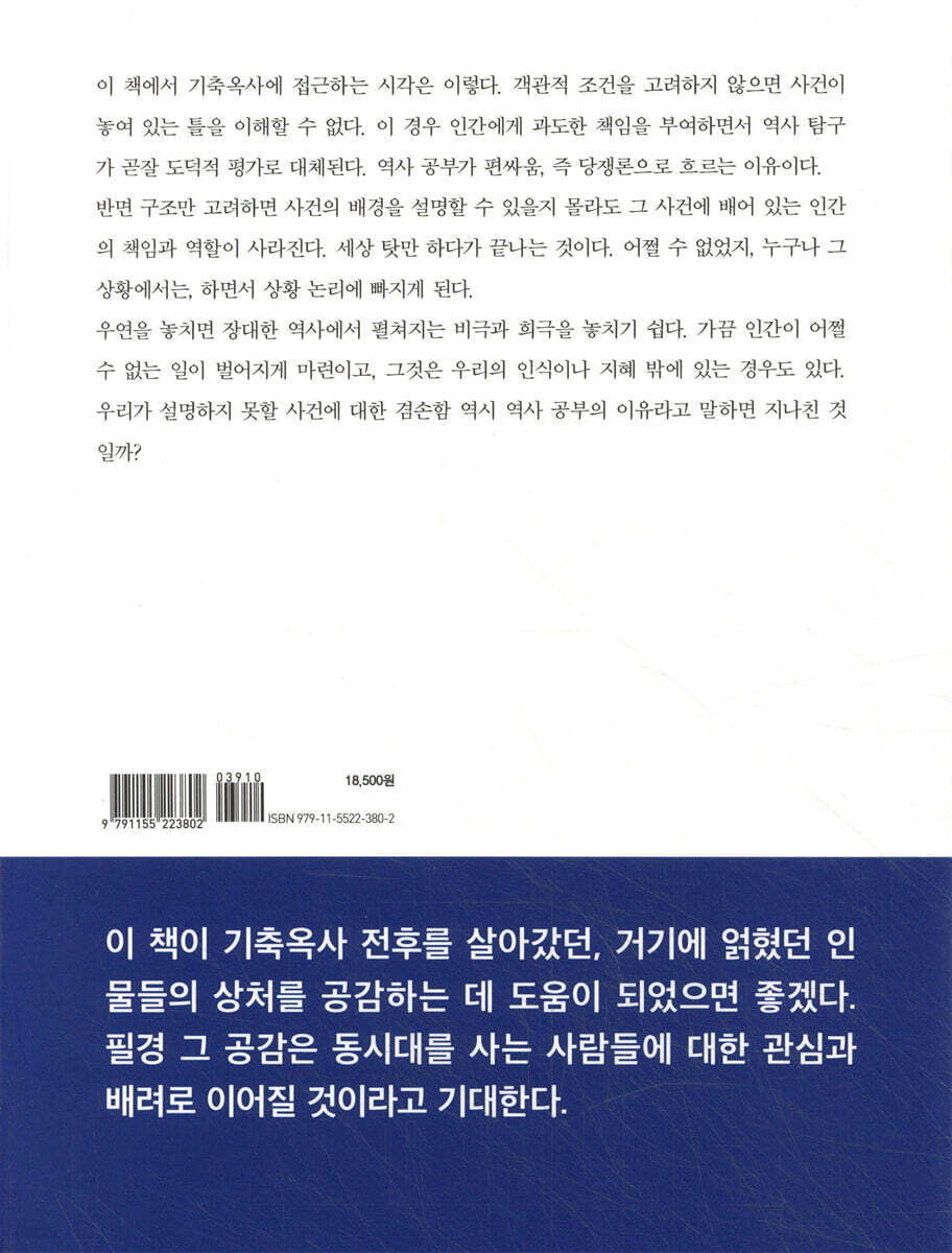 --- p.46 역사가 승자의 기록이거나 당파심의 기록이라면 역사학은 성립할 수 없다. 어떤 사건의 흔적이 검사의 것만도 피의자의 것만도 아닌 것과 마찬가지이다. 어떤 사건이든 진실의 영역이 있고, 역사학은 승패나 당파심을 넘어 진실을 찾으려는 많은 사람들의 노력을 통해 삶의 가치를 일깨워주거나, 적어도 파괴적이고 비생산적인 갈등으로 빠지는 것을 막아주었다. --- p.139 모든 사건은 조건, 의지, 우연이 합쳐져서 생긴다. 역사는 사건에 대한 탐구이므로 모든 사건을 탐구할 때는 조건, 의지, 우연을 다 살펴야 한다. 조건만 따지다 보면 인간의 책임을 물을 수 없고, 의지만 따지다 보면 사람 탓만 하면서 당쟁론처럼 누군가에 대한 추궁, 원망, 비판에 빠진다. 우연만 생각하는 경우에는 불가지론, 상대주의에 빠진다. --- p.165 의심은 자료의 확실성을 압도하기 쉽다. 더구나 자료가 불확실하면 의도하든 의도하지 않든 의심 및 기억의 편향성은 강화된다. 이때 의심이 억울함까지 수반하면 사람은 억울함을 해소하거나 극복하기보다 되새기며 상처를 유지하고 덧낸다. 그럴 때 우리는 기억을 다시 점검하여 건강성을 점검할 필요가 있다. --- p.186 사람들이 서로 다르게 알고 있는 사실이 있을 때, 우리는 갈등을 부추기는 방향으로 풀지, 서로 양해할 수 있는 방향으로 풀지 선택할 수 있다. --- p.187 |
