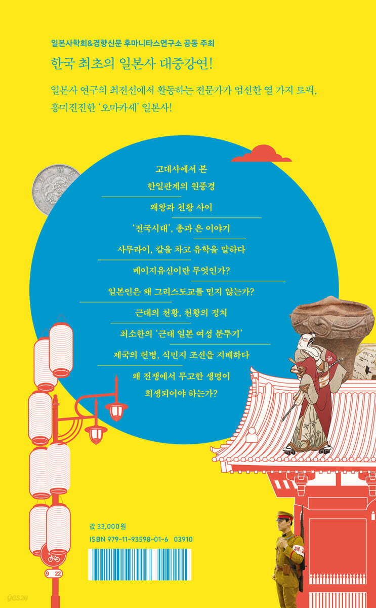 1강 고대사에서 본 한일관계의 원풍경 | 이재석 2강 왜왕과 천황 사이 | 김현경 3강 ‘전국시대’, 총과 은 이야기 | 박수철 4강 사무라이, 칼을 차고 유학을 말하다 | 김선희 5강 메이지유신이란 무엇인가? | 박훈 6강 일본인은 왜 그리스도교를 믿지 않는가? | 박은영 7강 근대의 천황, 천황의 정치 | 박삼헌 8강 최소한의 ‘근대 일본 여성 분투기’ | 이은경 9강 제국의 헌병, 식민지 조선을 지배하다 | 이승희 10강 왜 전쟁에서 무고한 생명이 희생되어야 하는가? | 서민교 찾아보기 도판 출처 |