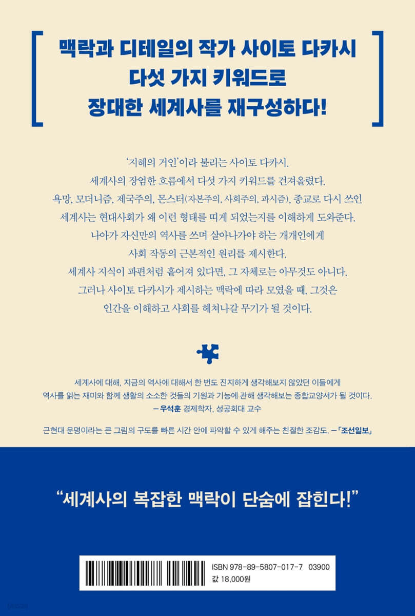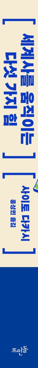 다섯 가지 키워드로 장대한 세계사를 재구성하다! 저자는 세계사의 장엄한 흐름에서 다섯 가지 키워드를 건져 올렸다. 욕망, 모더니즘, 제국주의, 몬스터(자본주의, 사회주의, 파시즘), 종교로 다시 쓰인 세계사는 현대사회가 왜 이런 형태를 띠게 되었는지를 이해하게 도와준다. 나아가 자신만의 역사를 쓰며 살아나가야 하는 개개인에게 사회 작동의 근본적인 원리를 제시한다. 세계사 지식이 파편처럼 흩어져 있다면, 그 자체로는 아무것도 아니다. 그러나 저자가 제시하는 맥락에 따라 모였을 때, 그것은 인간을 이해하고 사회를 헤쳐나갈 무기가 될 것이다. 세계사를 사유하고 통찰하는 다섯 가지 코드 욕망 + 모더니즘 + 제국주의 + 몬스터 + 종교 『세계사를 움직이는 다섯 가지 힘』은 세계사를 관통하는 커다란 이슈들을 중심으로 역사 전반을 날카롭게 분석하며, 인류가 지나온 자취를 꼼꼼히 살피고 사유하게 하는 다양한 시각을 제시한다. 저자는 인간의 감정이 세계사의 흐름에 중요한 역할을 했다는 전제에서 그 감정이 만들어낸 욕망, 모더니즘, 제국주의, 몬스터(자본주의, 사회주의, 파시즘), 종교의 다섯 가지 힘을 제기한다. 1장에서는 ‘욕망’이라는 코드에서 출발하여 커피와 차, 혹은 알코올과 코카콜라가 어떻게 세계사의 큰 흐름을 만들고 변화시켜왔는지, 사람의 욕망을 자극하는 금은 어떤 과정을 통해 세계경제의 확고한 틀을 만들었고, 욕망을 자극하지는 않지만 강함과 실용성으로 무장한 철은 또 어떻게 세상을 뒤흔들고 지배해나갔는지 차근차근 살펴본다. 또한 브랜드와 도시가 욕망을 바탕으로 한 세계사에서 왜 그토록 중요한 의미를 갖는지도 파헤친다. 2장에서는 ‘모더니즘’ 코드를 통해 마치 브레이크 페달이 고장 난 기관차처럼 점점 더 가속력을 갖게 된 근대문명은 어째서 필연적으로 치명적인 딜레마에 빠질 수밖에 없었는지 날카롭게 통찰한다. 그리고 방향을 조금 바꿔, 가장 근대적인 철학자로 자타가 공인하는 데카르트 철학의 영향을 받아 신체를 경시하게 된 유럽의 근대사회가 왜 유독 ‘시각’만은 중시할 수밖에 없었는지 밝혀낸다. 또한 ‘원근법’은 왜 다른 시대 다른 공간이 아닌 바로 ‘유럽의 르네상스시대’에 발명될 수밖에 없었는지도 고찰한다. 그 연장선상에서 근대사회가 ‘보다-보여지다’라는 구조를 극대화시켜 ‘보는 자’가 ‘보여지는 자’를 지배하는 메커니즘을 만들어낸 과정도 꼼꼼히 따져본다. 3장에서는 마케도니아 제국을 비롯해 로마제국과 이슬람제국, 진나라 등 중세와 근대를 움직인 ‘제국주의’가 실은 힘을 과시하고, 남을 지배하고 정복하고자 하는 욕망을 주체하지 못한 남자의 천성에서 연유한 거라고 분석하며, 글로벌기업 마이크로소프트와 구글 안에 어떻게 제국주의의 메커니즘이 고스란히 반영되어 나타나고 있는지도 밝혀낸다. 4장에서는 세계사에 나타난 몬스터들 - 자본주의, 사회주의, 파시즘을 다룬다. 자본주의라는 ‘녹슨 기관차’는 왜 멈추지 않는지, 나치스의 파시즘은 초기에 어떻게 전 국민의 호응을 받을 수밖에 없었는지, 현대세계는 과연 파시즘을 무너뜨렸는가에 대해 고찰해본다. 5장에서는 종교의 관점으로 넘어가, ‘일신교 3형제(유대교, 기독교, 이슬람교)’가 거의 모든 인류 전쟁사의 주범이 될 수밖에 없었던 기막힌 역사와 ‘사랑의 종교’인 기독교가 제국의 야망과 하나가 되고, 기본적으로 관용적인 이슬람교가 전 세계적인 분쟁의 불씨가 되어버린 아이러니한 역사도 짚어본다. 무엇이 세상을 움직여왔는지, 큰 흐름으로 살펴보면 인류 역사를 좀 더 쉽고 적확하게 이해할 수 있다. 학창 시절 누군가에게 쫓기듯 강박관념을 가진 채 세부지식에 연연하며 세계사를 공부한 것이 전부인 사람은 이 책에서 완전히 새로운 역사를 만나게 될 것이다. 세계사의 맥락을 단숨에 잡아 주는 쓸모 있는 종합 교양서 이 책은 2009년 한국에 첫 출간이 되자마자 독자들의 열렬한 호응을 받으며 10개월 만에 무려 10만 부가 판매되었다. 한국생산성본부 ? 삼성경제연구소 ? 현대경제연구원에서 CEO 필독서로 선정되었고, 한국출판인회의? 책따세? 행복한아침독서? 인디고서원 등의 유수의 독서단체에 추천되기도 했다. 꽤 오랫동안 전국 서점 역사 문화 분야의 1위를 차지한 것은 물론이다. 그렇다면 이렇게 독자들을 사로잡은 비결은 뭘까? 그간의 정형화된 연대기적 세계사를 벗어나, 심오함과 난해함, 복잡다단함과 거리를 두고 명쾌하게 역사의 큰 줄기를 잡아내는 통찰력 때문이다. ‘맥락’과 ‘디테일’의 저자 사이토 다카시가 통찰력 있게 풀어내는 역사 이야기를 읽다 보면 세계사의 복잡한 맥락이 머릿속에서 시원하게 정리가 된다. 또한 우석훈 경제학자가 해제에서 밝혔듯이, 역사를 읽는 재미와 함께 생활의 소소한 것들의 기원과 기능에 관해 생각해 보는 재미를 제공하고 있어, 세계사를 별로 접해 보지 않은 독자들에게 백과사전식 지식이 담긴 ‘종합 교양’에 대한 흥미를 불러일으키는 점도 이 책의 큰 매력이다. 15년 만에 개정판을 내게 된 이 책은 손에 쉽게 잡히는 판형과 감각적인 디자인으로 