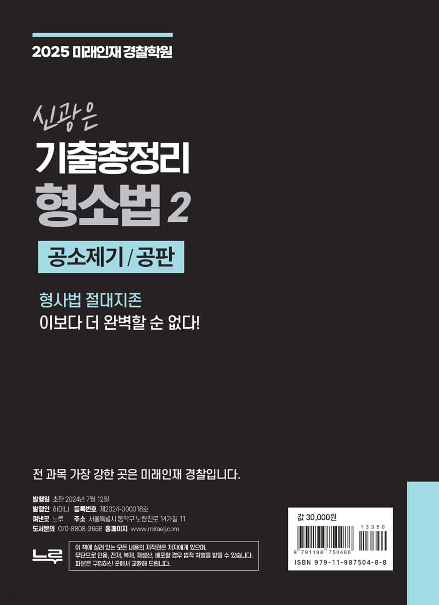 신광은 “형사소송법Ⅱ(공소제기·공판) 기출총정리”를 출간하면서... 그 동안 과분한 애정과 아낌없는 관심으로 신광은 형사소송법Ⅱ(공소제기·공판) 기출총정리 출간을 위해 기대와 응원을 해 준 많은 수험생들에게 고마운 마음을 전합니다. 최근 점점 더 중요해지는 형사소송법 시험에 대비하기 위해 2015년도에 ‘신광은의 한 수 기출 형사소송법’을 출간하였습니다. 그 이후 수험생들에게 경제적인 부담을 덜어주기 위하여 최근 기출문제를 부록으로 추가하다 보니 약 50페이지가 늘어나게 되었습니다. 하지만 이런 점들이 수험생들에게 심리적으로 부담되는 것으로 판단되고 더 완벽하고 철저한 기출문제집을 집필해야겠다는 생각이 절실하여 신광은 형사소송법Ⅱ(공소제기·공판) 기출총정리를 출간하게 되었습니다. 본서에 수록된 기출문제는 처음부터 끝까지 필자가 직접 기출문제를 풀어보며 설문을 분석, 재구성하고 적절한 해설을 추가하는 등 학습효과 극대화를 위해 상당한 시간과 노력을 기울였음을 말씀드립니다. 본서의 주요 특징은 다음과 같습니다. 1)최근 16개년(2009년~2024년) 전 직렬 형사소송법 기출문제를 빠짐없이 수록 본 교재에는 최근 시행된 2024년 1월 법원직 기출문제를 포함하여 최근 16개년(2009년~2024년) 동안 출제된 경찰채용 및 승진, 경찰간부와 해경간부 등 경찰직 형사소송법의 모든 기출문제와 법원직·검찰직·교정직·보호직, 그리고 소방간부(2016년~2024년) 등 형사소송법의 모든 기출문제를 빠짐없이 수록하였습니다. 2)최신 기출문제를 통한 출제경향 파악 및 예상문제에 완벽대비 전 직렬 최신 기출문제를 통해 앞으로의 출제경향 파악은 물론, 과거의 출제경향을 정확히 파악하여, 출제가능성이 높은 문제를 판단하여 본인의 공부방향을 설정함으로써 다가 올 시험에 완벽하게 대비할 수 있도록 하였습니다. 3)문제에 대해 정확한 이해를 돕기 위한 풍부하고 완벽한 해설 각 문제마다 풍부하고 꼼꼼한 해설을 추가하여 학생들 스스로 문제를 이해하고 혼자 공부하는 데에 어려움이 없도록 하였습니다. 4) 회독 및 이해여부 체크기능을 통한 학습효과 극대화 각 문제마다 상단에 “(1)(2)(3)”으로 회독 수를 표시할 수 있도록 함으로써 수험생들이 반복 학습을 하는데 있어서 회독 수를 체크하고, 더불어 문제를 풀고 난 후 오답여부를 ○·× 등으로 체크할 수 있도록하여, 자신이 정답을 맞혔는지 여부를 빠르게 확인하여 부족한 부분에 대해 효율적이고 집중적으로 공부함으로써 학습효과를 극대화할 수 있도록 도움을 주고자 하였습니다. 5) 문항별 난이도 표시를 통한 자기주도학습 각 문제마다 번호 하단에 난이도를 ?(하), ??(중), ???(상)으로 표시함으로써 수험생분들이 스스로 문제를 푸는 데 도움을 주고자 하였습니다. 6) 형사법 고득점 및 합격을 가능하게 해주는 필독서 본 교재는 최단기간 내에 한권의 문제집으로 형사소송법의 수사와 증거파트의 모든 내용을 완벽하게 정리하고 최고의 성과를 올릴 수 있도록 아래와 같이 구성하였습니다. 1)경찰직, 국가직, 법원직, 소방간부 등 전 직렬의 문제를 빠짐없이 수록하여 모든 직렬의 시험에 충분히 대비할 수 있도록 하였습니다. 2)문제의 순서는 신광은 형사법 기본서의 진도와 동일하게 배열하여 기본서의 내용을 복습, 정리하고 그 바탕 위에서 실전 감각을 키울 수 있도록 하였습니다. 3)각 주제별로 변형된 표현이나 반대 설문들로 구성된 ‘확인학습’ 문제를 추가함으로써 다시 한번 부족한 부분을 보충하고 복습, 정리할 수 있도록 하였습니다. 4)문제에 대한 상세한 해설은 물론 설문과 관련하여 참고할 사안을 요약 정리하였고, 문제를 통하여 체크하고 암기해야 할 부분을 굵은 고딕체로 강조함으로써 수험생들이 부족한 시간을 이용하여 보다 빠르고 효과적인 학습을 할 수 있도록 하였습니다. 7) 한권으로 정복하는 최신, 최적, 최고의 형사법 기출문제집 본 교재는 전직렬의 기출문제를 빠짐없이 수록함은 물론 수험생들이 최단기간 내에 최고의 성과를 거둘 수 있도록 풍부한 해설과 정리, 확인학습문제, 회독체크 및 키워드 강조 등 여러가지 형태로 세심한 배려를 하였습니다.또한 최근 법령내용과 시험경향에 크게 맞지 않은 문제들은 제외하거나 변경하였고, 여러 교재에서 발견된 오류 등을 바로 잡았습니다.따라서 형사법을 공부하는 수험생들에게 가장 최적화 된 교재, 최신내용을 포함한 교재, 수험생들의 합격을 앞당길 수 있도록 한 최고의 형사법 기출문제집이라고 감히 말씀드립니다. 아무쪼록 본서를 통해 모든 수험생들이 형사법 고득점 및 시험 합격이라는 기쁨을 누리길 기원하며, 더불어 힘든 수험기간 동안 건강 유의하시기를 진심으로 바랍니다. Bravo Your Life!! 편저자신광은 교재의 특징 - 최근 개정법령 및 개정규칙 완전반영 - 주제에 따른 진도별 단계별 문제를 통해 기본 이론과 판례를 학습 - 전 직렬 최근 기출문제, 최신판례 완벽반영 및 최신경향 문제 완벽대비 - 문제에 대한 정확한 이해를 돕기 위한 풍부하고 꼼꼼한 해설 - 출제가능한 모든 기출지문과 중요설문 빠짐없이 수록 |