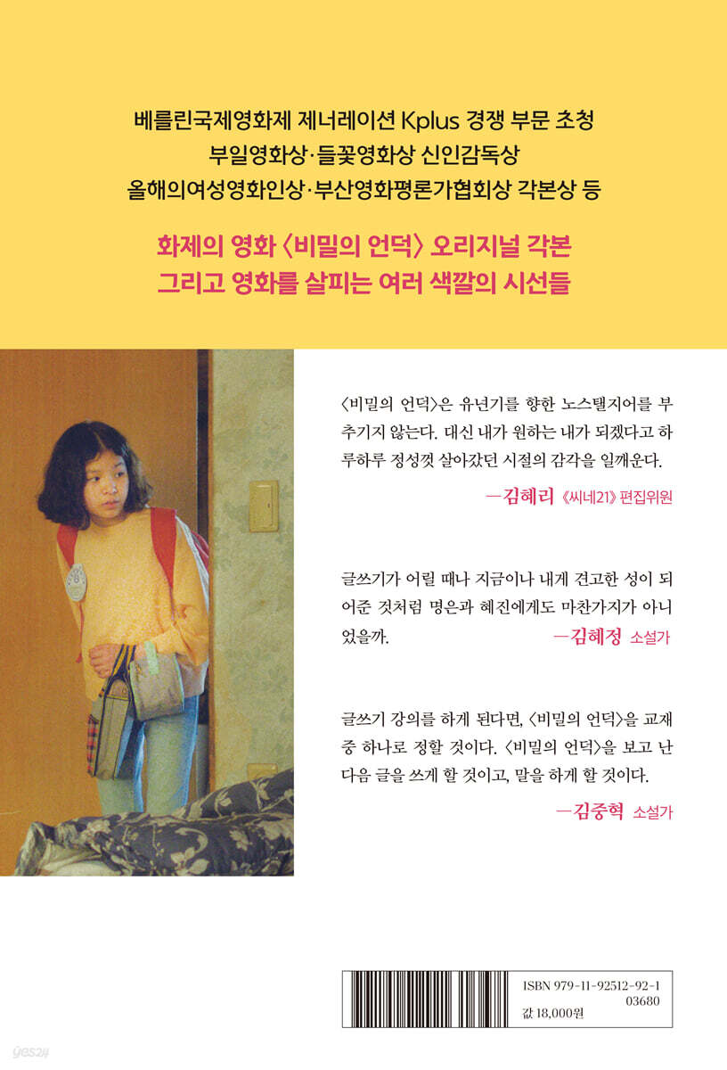 ---「이지은, 작가의 말」중에서 열두 살의 세계를 그린 〈비밀의 언덕〉은 신기하게도 유년기를 향한 노스탤지어를 부추기지 않는다. 대신 내가 원하는 내가 되겠다고 하루하루 정성껏 살아갔던 시절의 감각을 일깨운다. 나의 비겁을 깨달은 순간의 서늘한 부끄러움, 모순 앞에 부서졌다가도 더 키가 자라 일어섰던 회복력을 그리워하게 만든다. ---「김혜리, 언덕에 올라 돌아보다: 이지은 감독 인터뷰」중에서 현실은 내게 친절하지만은 않다. 왜 자꾸 나를 힘들게 하고 괴롭히는지 도저히 알 수 없을 때가 많다. 그럴 때면 나는 이야기 속으로 숨었다. 글쓰기가 어릴 때나 지금이나 내게 견고한 성이 되어준 것처럼 명은과 혜진에게도 마찬가지가 아니었을까. ---「김혜정, 나는 왜 썼는가, 왜 쓰는가, 왜 쓸 것인가: 글쓰기라는 성城」중에서 〈비밀의 언덕〉은 글쓰기에 대한 영화다. 이렇게 단정짓는 건 감독에 대한 예의가 아니다. 〈비밀의 언덕〉은 성장 영화일 수 있고, 친구에 대한 영화일 수도 있고, 비밀과 거짓말에 대한 영화일 수도 있고, 가족에 대한 영화일 수도 있고, 선생님의 중요성에 대한 영화일 수도 있다. 좋은 영화는 원래 여러 가지 얼굴을 동시에 가지고 있다. 그래도 나는 글쓰기에 대한 비밀을 알려주는 영화라고 우기고 싶다. ---「김중혁, 솔직한 글은 무조건 좋은 걸까」중에서 |