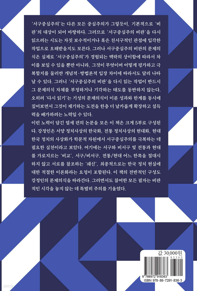 제1부 | 동서 사상의 교차와 횡단 : ‘서구중심주의 비판’ 다시 읽기의 배경 01 사상의 번역, 번역의 사상 : 번역을 통해 본 강정인의 정치학 02 강정인의 ‘동·서 통섭(通涉)’에 대한 비판적 고찰 제2부 | ‘서구중심주의 비판’의 문제의식 : 타당성과 유효성? 03 한국적 민주주의와 한국적 헌정주의 04 “서구에 수렴하는 정상화 과정”이라는 문제 : 강정인의 사유 궤적에 대한 비판적 독해 05 강정인의 서구중심주의 비판과 그 정치사상적 특징 : 아민의 유럽중심주의 비판과의 비교를 중심으로 제3부 | 방법(론)으로서의 ‘서구중심주의 비판’ : 비교의 시각과 근거 06 비교정치이론에서의 비교의 함의와 그 방법에 대한 소고 07 탈서구중심주의 비교정치이론 방법론의 모색 : 강정인의 ‘상사성’ 비유와 ‘개념적 중립성’ 제4부 | 동·서양 정치사상과 ‘서구중심주의 비판’ : 재비판 혹은 재해석 08 유가정치사상에서 이상주의와 현실주의의 중첩 : 강정인의 독법을 중심으로 09 덕치/법치와 동서 통섭 : 강정인의 논의를 중심으로 10 존 로크의 정치사상과 서구중심주의 11 사회계약론을 다시 생각하기 제5부 | ‘한국 정치사상의 재구성’이라는 문제의식 : 보완과 적용 12 이승만의 자기 인식과 권위주의의 정당화(1945.10-1950.6) 13 2000년대 한국의 ‘탈민족주의’ 논쟁 연구 : 주요 쟁점과 기여 참고 문헌 |