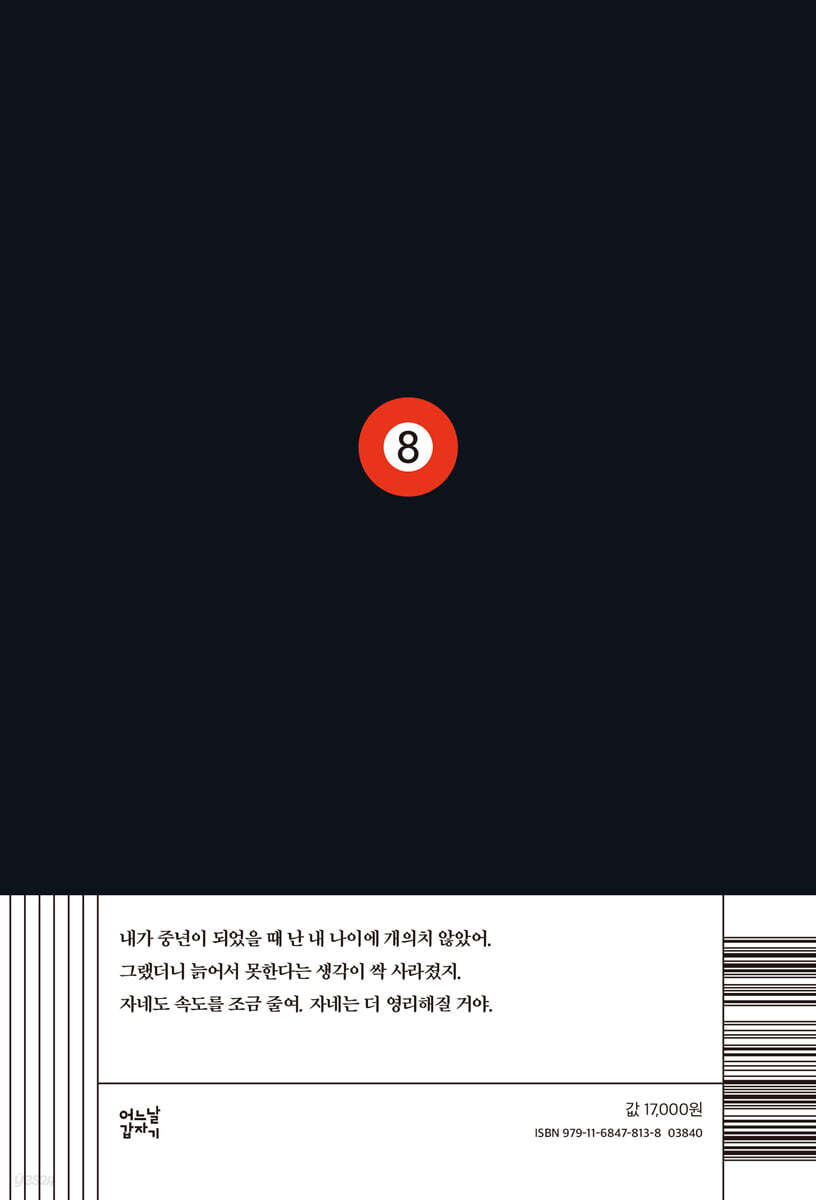 “아까 나인볼 토너먼트에 대해 이야기했었잖아요.” 에디가 반문했다. “지금은 에잇볼이네요.” “걷기 위해서는 우선 기는 것부터 해야지.” “그게 무슨 뜻이에요?” “자네는 아직 나인볼을 할 준비가 되어 있지 않네, 패스트 에디. 보차드는 자네 바로 위에서 걸어갈 거고, 다른 선수 대여섯 정도가 그러고 있을 거라고. 자네는 두뇌와 경험으로 에잇볼을 칠 수 있어.” - “에디,” 조금 뒤 뚱보가 비행기에서 말을 걸었다. “자네 원래 하던 방식으로 공을 치지 않더군.” “그땐 애였죠. 지금은 중년이고.” “중년이라는 건 존재하지 않아, 패스트 에디. 그건 미디어가 만들어 낸 말이지. 미디어가 사람들을 길들이는 그런 거지.” “그 말이 맞을 수도 있겠네요.” “나는 예순이 넘었어.” 뚱보가 페리에를 마시며 말했다. “내가 중년이 되었을 때 난 내 나이에 개의치 않았어. 그랬더니 그런 생각이 싹 사라졌지. 자네도 속도를 조금 줄여. 자네는 더 영리해질 거야. 그거면 된다고.” - “패스트 에디. 당구를 치지 않으면, 자네는 아무것도 아닌 거야.” “이거 왜 이래요. 인생에는 다른 할 것들도 많거든요? 당구 치는 거 말고 다른 거에 자존심을 가지면 되죠.” “아니, 그렇게 못 해. 자네는 안 돼.” “왜 안 되죠? 평생 당구를 치겠다는 계약서에 사인을 한 것도 아닌데.” “자네는 자기 자신을 위해 서명을 한 거야. 나는 지난 40년간 수도 없는 사람들과 당구 경기를 했지. 그런데 자네는 내가 본 사람들 중 최고였어.” “그건 이미 20년 전 일이에요. 지금은 1983년이라고요. 나는 이제 더 이상 젊지 않잖아요.” - “당구 선수가 아니었다면 나는 아무것도 아니었을 거네. 나는 당구를 치기 때문에 나 자신이 될 수 있는 거야.” “당신 말이 틀릴 수도 있잖아요.” “내 말이 맞아. 하루에 여덟 시간씩 연습하게. 돈을 걸고 사람들과 경기하라고.” “모르겠어요…….” 에디가 털어놓았다. “나도 잘 알아.” 뚱보가 말했다. “연습하지 않으면 자네 공은 위축될 거고 밤에 잠을 이룰 수 없을 거야. 자네는 패스트 에디 펠슨이라고, 괴물 페스트 에디. 나랑 붙으면 무조건 이겨야 한단 말이네. 젠장할, 이렇게 멍청하게 앉아 있지 말라, 이 말이야.” “꼭 죽느냐 사느냐의 문제인 것처럼 들리네요.” “죽느냐 사느냐의 문제가 맞으니까.” --- 본문 중에서 |