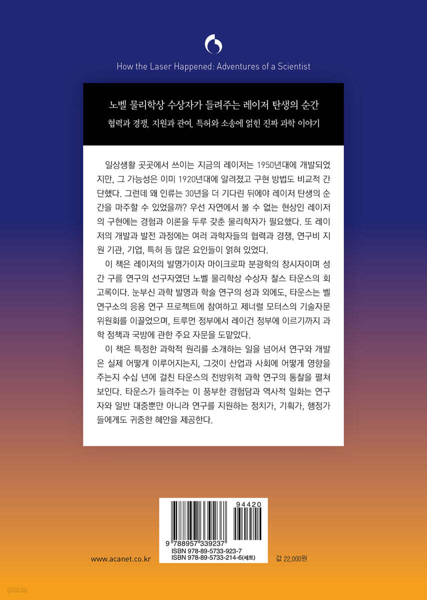 “레이저 탄생에 대한 놀라운 이야기를 넘어 과학계와 기술계, 산업계와 정부에 지대하게 공헌한 진짜 과학자의 매혹적이고 진솔한 회고록” - 마빈 (머프) 골드버거 (전 캘리포니아 공과대학 총장)