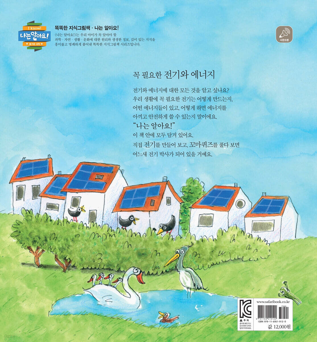 나는 하루에 전기를 얼마나 쓸까요? 그리고 무심코 흘려보내는 전기는 어느 정도나 될까요? 우리 생활에 꼭 필요한 에너지는 여전히 대부분 석유나 석탄 같은 화석 연료를 태워서 만들어요. 세계 인구는 점점 늘어나고 사용하는 전기 제품도 엄청 많아지고 있어요. 전기를 많이 사용할수록 화석 연료를 많이 태워야 하는데, 화석 연료는 사용하면 할수록 오염 물질이 많이 나와요. 그래서 산성비가 내리거나 스모그가 심해지고, 지구 온난화로 홍수와 폭풍, 폭염, 사막화 같은 기후 이상으로 많은 사람들은 물론이고 동식물들까지 삶의 터전과 목숨을 잃어가고 있지요. 《나는 알아요_전기와 에너지》는 전기 없이 살았던 옛날부터 온실가스를 줄일 수 있는 미래의 재생 에너지까지 쭉 담겨 있어요. 바람의 힘을 이용하는 풍력 에너지, 태양열과 태양광을 모아 전기 에너지로 바꾸어 사용하는 태양 에너지 등 자연으로부터 얻는 재생 에너지의 장점과 단점도 알 수 있지요. 실생활에서 전기 사용을 줄일 수 있는 방법도 아이들 눈높이에 맞게 알려 주어요. 전기를 절약할 수 있도록 전등 바꾸기, 한겨울이나 한여름에 집 안 온도를 알맞게 유지하기, 샤워 시간 줄이기, 쓰지 않는 전기 플러그 뽑기 등 전기를 무심코 흘려 버리지 않을 방법을 어렵지 않게 알려 주어요. 우리들의 작은 노력들이 모이면 많은 에너지를 절약할 수 있어요. 그리고 지구를 지키는 데에도 큰 도움이 된답니다. 책을 읽은 뒤 나만의 에너지 절약 방법도 생각해 보세요. 한눈에 보고 한번에 쏙쏙 이해하는 알기 쉬운 지식 그림책 ‘나는 알아요!’ 시리즈는 많은 호기심을 갖고 세상을 바라보기 시작하는 아이들에게 알려 주고 싶은 주제를 명쾌하게 풀어낸 지식 그림책이에요. 아이들의 눈높이에 맞게 설명한 ‘꼬마 지식’에서는 본문과 연계된 상식을 다루어 폭넓게 사고할 수 있도록 도와주고, 맨 마지막에 수록된 ‘놀이 활동’과 ‘꼬마 퀴즈’를 통해 앞에서 배운 개념과 원리를 한 번 더 복습할 수 있지요. 또한 《나는 알아요! 전기와 에너지》은 누리과정(자연탐구: 자연과 더불어 살기)과 초등 6학년 2학기 과학 (5단원. 에너지와 생활) 교과 과정과 연계되어 있어 더욱 유익합니다. 아이들이 책을 덮었을 때 “나는 알아요!” 하고 자신 있게 말할 수 있도록 책을 읽으며 함께 이야기를 나눠 보는 건 어떨까요? 이 그림책은 사파리펜으로도 풍부하고 생생한 효과음을 들을 수 있어요. 사파리 전용 사운드펜을 글자에 갖다 대면 처음부터 끝까지 친절하게 읽어 주고, 문장별로도 들을 수 있어요. 또한 처음부터 끝까지 그림을 음성펜으로 누르면 상황에 맞는 등장인물들의 대사도 들을 수 있지요. 부모님이 읽어 주지 않아도 생생하게, 지루하지 않게 입체적인 책 읽기를 경험할 수 있을 거예요. |