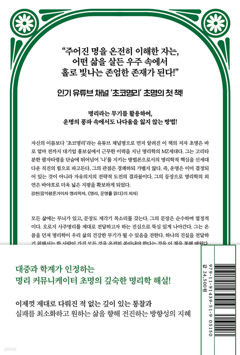 자신의 이름보다 ‘초코명리’라는 유튜브 채널명으로 먼저 알려진 이 책의 저자 초명은 바로 얼마 전까지 대기업 홍보실에서 근무한 이력을 지닌 명리학의 MZ세대다. 그는 고리타분한 팔자타령을 단숨에 뛰어넘어 ‘나’를 지키는 방법론으로서의 명리학적 핵심을 신세대다운 직진의 힘으로 파고든다. 그의 관점은 경쾌하되 가볍지 않다. 즉, 운명은 이미 결정되어 있는 것이 아니라 자유의지의 전략적 도전의 결과물이다. 그의 등장으로 명리학의 외연은 바야흐로 더욱 넓은 지평을 확보하게 되었다. - 강헌 (음악평론가이자 명리학자, 《명리, 운명을 읽다》의 저자)