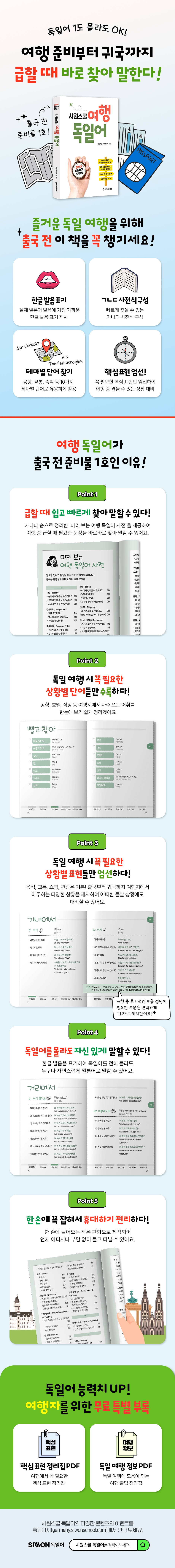 미리 보는 여행 독일어 사전 PART 1 기내에서 PART 2 공항에서 PART 3 거리에서 PART 4 택시 & 버스에서 PART 5 전철 & 기차에서 PART 6 호텔에서 PART 7 식당에서 PART 8 관광할 때 PART 9 쇼핑할 때 PART 10 귀국할 때 |