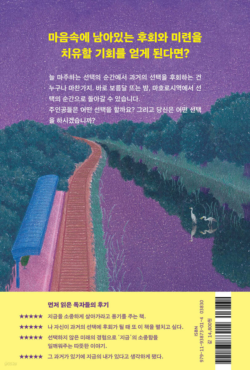 첫 번째, 소부선 전철을 타고 신코이와역에서 히라이역까지의 구간을 통과해야 합니다. 그 구간에서도 아라카와강과 나카가와강 사이를 잇는 다리 위, 특히 히라이역 방향 하천 부지의 큰 느티나무가 보이는 부근이 제일 중요합니다. 그리고 두 번째, 그 장소를 통과할 때의 타이밍도 중요하답니다. 마호로시역에 도착할 기회는 한 달에 거의 한 번 정도에 불과합니다. 바로 정확히 보름달이 떴을 때 뿐이죠. 그리고 마지막 세 번째, 이게 가장 핵심입니다. 전철을 탄 본인이 과거로 돌아가 일을 되돌릴 수 있으면 좋겠다는 절절한 후회를 마음에 품어야 합니다. 그 모든 조건이 갖춰졌을 때, 마호로시역에 도착할 수 있습니다. --- p.7 “당신에게 인생의 분기점은 언제인가요?” --- p.10 “……제가 너무나 작은 존재였다는 점, 그리고 나이만 먹었지 여전히 마음은 성장하지 않았던 미숙함을요. 그리고 지금 이렇게나 소중한 사람이 곁에 있다는 것을 다시금 깨달았습니다. 이렇게 소중한 것들에 둘러싸여 살았는데도 그걸 알아차리지 못했다니…….” --- p.73 “더는 손에 넣을 수 없는 과거의 것을 세는 것보다 지금 눈앞에 있는 소중한 것의 수를 세어보는 게 어떠세요?” --- p.73 “과거의 세계에서 보내는 시간이 마야마 씨께 아주 좋은 기분 전환이 된다면 좋겠습니다. 분명 뭔가 달라질 테니까요.” --- p.155 “굳이 머리로 생각할 필요 없어. 그냥 그러려니 하고 받아들이기만 하면 돼. 솔직히 이런 신기한 역의 존재를 누가 이해할 수 있겠어? 이런 외진 장소에 오게 될 줄은 꿈에도 상상 못 했잖아, 안 그래?” --- p.204 “어떤 안 좋은 일이 일어났을 때 ‘인간사 새옹지마’라는 말 덕분에 힘을 얻을 수 있다면 그걸로 충분해. 하지만 그렇다고 해서 만사를 신경 쓰지 말고 그냥 받아들이라는, 그런 얼토당토않은 이야기는 아니지. 왜냐하면 우린 평범한 사람이잖아. 그러니 매일 눈앞에 벌어지는 일에 풀도 죽고 끙끙 고민하기도 하지. …… 하지만 난 그래도 괜찮다고 생각해. 그저 우리는 좋은 일도, 나쁜 일도 그 자리에서 일희일비하면서 일상을 보내기만 하면 돼. 그렇게 조금씩 앞으로 나아가는 것도 삶의 한 방식 아닐까?” --- p.239 “……앞으로 가고 있네?” 정말 그랬다. 뒤를 돈 상태로 뒤쪽을 향해 나아가니 앞을 향해 전진하는 것과 마찬가지였다. 마치 마이너스를 뺄셈식에 넣을 때 플러스가 되는 것처럼. “그렇지? 다 그런 거야. 그것도 또 하나의 삶의 방식이지.” --- p.241 “……당신은 워낙 성실하니까 도저히 설명할 수 없는 불합리한 일이 일어났을 때 운이 좋았느니 나빴느니 그런 쪽으로 원인을 돌리고 싶지 않아서 모두 자기 책임이라고 할 거야. 그러는 편이 원인과 결과를 정리하기 편하고 설명이 딱 맞아떨어지니까. ……하지만 그런 식으로 모든 걸 자기 탓이라면서 자책하지 마. ……그런 건 스스로 너무 괴롭기만 해. 나 자신을 용서해도 되잖아. 당신 주변에 있는 사랑하는 사람도 당신이 그런 식으로 자책하길 바라지 않을 거야. ……바로 내가 그런 마음이니까.” 그리고 아카리는 내 눈동자를 정면으로 바라보며 말했다. “……당신은 지금까지 참 많이 노력했어. 정말 고마워. 나는 진심으로 그렇게 생각해.” --- p.298 “이 마호로시역에서는 과거의 분기점으로 돌아갈 수 있어요. 그렇지만 지금 오늘이 가쓰라기 씨께 있어서 완전히 새로운 하루예요. 그러니까 오늘을 다시금 새로운 인생의 분기점으로 삼으면 좋겠어요. 그리고 가쓰라기 씨의 말대로 아주 조금이라도 좋으니 앞을 보고 계속 나아가길 바라요…….” --- p.307 |