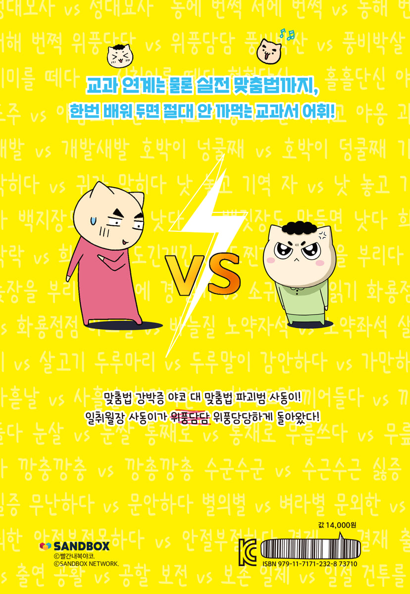 1장 : 사자성어·속담·관용구 속 기막히는 맞춤법 사동이의 일취월장(?) / 성대모사 vs 성대묘사 / 동에 번쩍 서에 번쩍 vs 동해 번쩍 서해 번쩍 / 위풍당당 vs 위풍담담 / 풍비박산 vs 풍비박살 / 시치미를 떼다 vs 시침이를 떼다 / 혈혈단신 vs 홀홀단신 / 야반도주 vs 야밤도주 / 눈 가리고 아웅 vs 눈 가리고 야옹 / 괴발개발 vs 개발새발 / 호박이 넝쿨째 vs 호박이 덩쿨째 / 기가 막히다 vs 귀가 막히다 / 낫 놓고 기역 자 vs 낫 놓고 기억 자 / 백지장도 맞들면 낫다 vs 백짓장도 맞들면 낫다 / 희희낙락 vs 희희낙낙 / 도긴개긴 vs 도찐개찐 / 늑장을 부리다 vs 늦장을 부리다 / 쇠귀에 경 읽기 vs 소귀에 경 읽기 / 화룡점정 vs 화룡점점 ㆍ 야코와 함께 노래를 : 끝까지 틀리지 않고 부를 수 없는 노래 3 2장 : 사동이가 틀려도 수군수군하는 맞춤법 맞춤법 대결 / 바느질 vs 바늘질 / 노약자석 vs 노약좌석 / 살코기 vs 살고기 / 두루마리 vs 두루말이 / 감안하다 vs 가만하다 / 사흗날 vs 사흘날 / 하마터면 vs 하마트면 / 끼어들다 vs 끼여들다 / 눈살 vs 눈쌀 / 통째로 vs 통채로 / 무릅쓰다 vs 무릎쓰다 / 깡충깡충 vs 깡총깡총 / 수군수군 vs 수근수근 / 싫증 vs 실증 / 무난하다 vs 문안하다 / 별의별 vs 벼라별 / 문외한 vs 무뇌한 / 안절부절못하다 vs 안절부절하다 ㆍ 야코와 함께 노래를 : 살면서 한 번쯤 꼭 해 본 짓 3장 : 이게 왜 달라? 아리송한 맞춤법 골목에서 마주친 무서운 형들 / 결제 vs 결재 / 출현 vs 출연 / 공활 vs 공할 / 보전 vs 보존 / 일체 vs 일절 / 건투를 빈다 vs 권투를 빈다 / 우유갑 vs 우유곽 / 다르다 vs 틀리다 / 조종 vs 조정 / 머지않아 vs 멀지 않아 ㆍ 야코와 함께 부르고 싶은 노래 : 애국가 4장 : 아는 만큼 보이는 띄어쓰기·문장 부호 사동이의 엉망진창 일기 / 한번 vs 한 번 / 못하다 vs 못 하다 / 같이 vs 같이 / 한 개, 두 개 vs 한개, 두개 / 큰 형 vs 큰형 / 친구 간과 일주일간 / 만큼 vs 만큼 / 대로 vs 대로 / 여러 가지 문장 부호 / 사동이의 완벽한 그림 일기 ㆍ 야코와 함께 노래를 : 나만 아니면 돼 |
