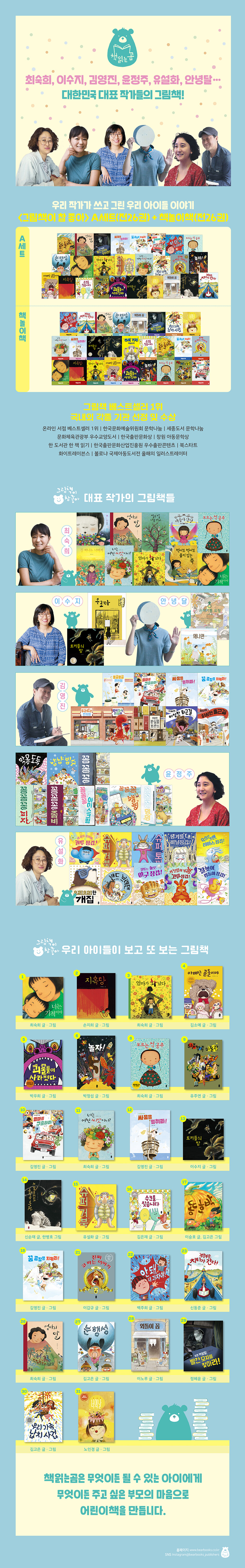 “너와 함께한 하루하루, 너와 함께한 한 달 한 달, 너와 함께한 한 해 한 해가 내겐 모두 기적이었어. 네가 내 아이라는 것, 그게 바로 기적이야.” 화이트 레이븐스│북스타트│예스24·인터파크·알라딘·리브로 올해의 책 002 지옥탕_손지희 글ㆍ그림 “너도 그 끔찍한 곳에 가 봤니? 뿌연 김이 모락모락 나고, 용암처럼 뜨거운 물이 부글거리고, 아이들의 비명 소리가 쩌렁쩌렁 울리는 지옥탕 말이야!” 불구덩이처럼 뜨겁고 바나나 우유처럼 달콤한 목욕탕 이야기. 문학나눔 우수문학│북스타트│한우리 열린교육│아침독서신문 추천 003 엄마가 화났다_최숙희 글ㆍ그림 엄마의 ‘화’에 상처받은 아이들에게 건네는 화해와 위로의 메시지. “미안해, 정말 미안해. 그리고…… 사랑해!” 아이와 엄마 사이에서 일상적으로 일어나는 갈등과 화해를 담은 그림책. 화이트 레이븐스│알라딘 올해의 책│북스타트│아침독서신문 추천 004 아빠는 곰돌이야_김소예 글ㆍ그림 ‘곰돌이 인형’과 ‘곰돌이 같은 아빠’의 영혼 체인지 소동! 곰돌이처럼 뒹굴뒹굴, 게으르던 우리 아빠가 갑자기 멋진 아빠가 되어 나타났어요. 날마다 일찍 퇴근하고 주말에도 우리랑 실컷 놀아 주는 아빠, 진짜 우리 아빠 맞아요? 문화체육관광부 우수교양도서│북스타트│아침독서신문 추천│화이트 레이븐스 005 괴물들이 사라졌다_박우희 글ㆍ그림 옛날에는 이 지구에 무시무시한 괴물이 아주아주 많이 살았대. 그런데 지금은 어디에서도 괴물을 볼 수가 없어. 괴물들이 이 지구에서 몽땅 사라져 버렸거든. 괴물들은 어디로 갔을까? 왜 그렇게 서둘러 지구를 떠난 걸까? 나랑 같이 괴물들의 뒤를 밟아 보지 않을래? 문화체육관광부 우수교양도서 006 놀자!_박정섭 글ㆍ그림 놀고 싶은 어린이들 모두 모두 모여라! 책상머리 백일몽을 넘어서서 온몸으로 뛰놀고 싶은 모든 어린이의 열망을 담은 무한 상상 그림책! 온종일 책상 앞에 앉아 있으려니 목도 뻐근하고, 다리도 저리고, 엉덩이도 아프고, 눈은 자꾸 감기고, 하품만 나오고, 계속 딴생각만 나고……. 이럴 땐 어떻게 할까? 그래, 우리 같이 놀자! 북스타트 008 모르는 척 공주_최숙희 글ㆍ그림 옛날 옛날, 어느 작은 성에 작은 공주가 살았어요. 왕과 왕비는 공주를 끔찍이 사랑했지요. 그러던 어느 날 밤새도록 무시무시한 소리가 들려오더니, 이튿날부터 성 안에 찬바람이 쌩쌩 불기 시작했어요. 공주는 무섭고 슬프고 화가 났지만 모르는 척 블록만 쌓았지요. 그러자 이상한 일이 생겨났어요. 어느새 공주가 높은 탑 안에 들어와 있는 거예요! 공주는 쓸쓸한 탑에서 나와 엄마 아빠한테로 돌아갈 수 있을까요? 문화체육관광부 우수교양도서 009 뒤죽박죽 미술관_유주연 글ㆍ그림 어느 월요일 아침, 조용해야 할 미술관이 온통 벌집을 쑤셔 놓은 것 같아요. 〈모나리자〉는 우아한 얼굴에 돋아난 송충이 눈썹 때문에 울상이고, 〈비너스의 탄생〉 속에선 아비뇽의 처녀와 바람의 신 제피로스가 티격태격 말다툼을 벌이고 있어요. 〈이삭 줍는 여인들〉은 어디서 났는지 텔레비전에 푹 빠져 있고, 〈생각하는 사람〉은 뒤샹의 〈샘〉을 가져다 큰 볼일을……. 으악! 도대체 미술관에서 무슨 일이 벌어진 걸까요? 010 엄마를 구출하라!―나로와 펄럭이의 모험 1_김영진 글ㆍ그림 “네 상상력이 세상을 구원할 거야!” 어느 날, 나로네 강아지 펄럭이가 사람처럼 벌떡 일어나 나로에게 말을 건네는 거야. 사실 펄럭이는 상상 세계 이루리아에서 온 특수 요원인데, 이루리아에 문제가 생겨서 나로의 도움이 필요하대. 왜 하필 틈만 나면 딴생각에 빠져 있는 나로냐고? 그야 나로가 세상에서 가장 상상력이 뛰어난 어린이니까! 상상력이라면 너도 나로한테 뒤지지 않는다고? 그럼 너도 같이 갈래? 한우리 열린교육 011 너는 어떤 씨앗이니?_최숙희 글ㆍ그림 최숙희 작가가 세상 모든 아이들에게 건네는 따뜻한 격려의 메시지! 온 마을에 향기를 퍼뜨리는 수수꽃다리, 따가운 햇살에도 퍼붓는 비에도 지지 않는 봉숭아, 누구라도 마주보며 빙긋 웃어 주는 접시꽃……. 나는 어떤 꽃을 품은 씨앗일까? 저마다 다른 색깔 다른 모양의 꽃을 피울 소중한 씨앗 같은 아이들을 위한 희망의 노래! 아침독서신문 추천│한 도서관 한 책 읽기 012 싸움을 멈춰라!―나로와 펄럭이의 모험 2_김영진 글ㆍ그림 “온 세상에 전염병처럼 번져 가는 싸움을 멈춰라!” 요즘 나로네 반에선 싸움이 끊이질 않아. 나로는 미르와 싸우고, 미르는 그린이와 싸우고, 그린이는 예원이와 싸우고, 예원이는 또……. 아무튼 아이들이 이렇게 싸워 대는 건 상상 세계 이루리아에 문제가 생긴 탓이래. 이대로 두면 온 세상에 싸움이 전염병처럼 번져서, 무시무시한 전쟁이 일어날지도 모른대! 나로와 펄럭이는 이 끝없는 싸움을 멈추고 친구들을 구해 낼 수 있을까? 013 토끼들의 밤_이수지 글ㆍ그림 그림책 작가 이수지가 선보이는 ‘엉뚱 오싹 발랄’ 토끼 이야기! 어느 뜨거운 여름날, 아이스크림 트럭 앞에 토끼 떼가 나타났다! 토끼들은 왜 트럭을 덮쳤을까? 트럭에 치인 친구를 위한 복수였을까? 아니면 무더위를 이기려 아이스크림 빼앗기 대작전을