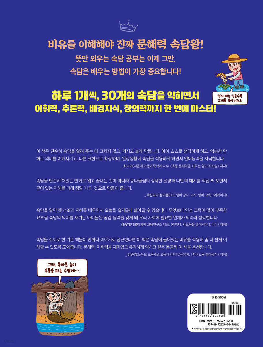 속담을 주제로 한 기존 책들이 만화나 이야기로 접근했다면 이 책은 속담에 들어있는 비유를 적용해 좀 더 쉽게 이해할 수 있도록 도와줍니다. 문해력, 어휘력을 재미있고 유익하게 익히고 싶은 분들께 이 책을 추천합니다. - 방종임 (유튜브 교육채널 교육대기자TV 운영자, 『자녀교육 절대공식』 저자)