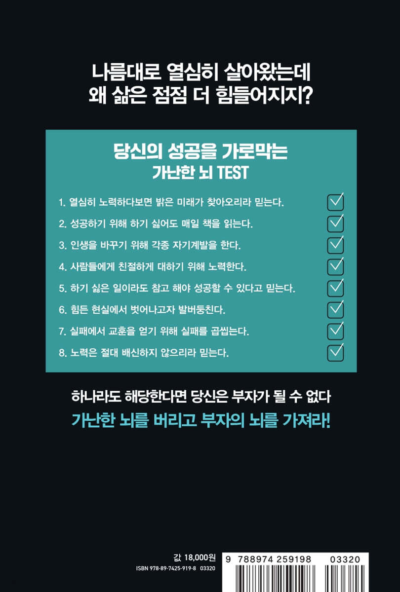 “나는 뇌를 바꾸고 10개월 만에 8억을 벌었다!” 입소문만으로 7,000명의 선택을 받은, ‘진짜 부자가 되는 방법’ 우리는 모두 부자가 되고 싶어한다. 그렇기에 매일매일 열심히 살고 때로는 자기계발을 하기도 한다. 그러나 이러한 노력에도 불구하고 우리의 인생은 좀처럼 나아지지를 않는다. 성과를 거둘 때도 있었지만 결국 시간이 지나고 보면 내 삶은 전보다 더 피폐해져있다. 대체 왜 이런 걸까? 세계 굴지의 뇌과학자들이 연구한 내용을 종합해보면, 우리가 열심히 살수록 우리의 뇌는 더더욱 가난해진다. 노력할 때마다 빈곤과 고통의 이미지가 뇌에 새겨지기 때문이다. 이 책은 아무리 노력해도 왜 우리의 인생이 나아지질 않는지, 그 이유를 명명백백히 알려준다. 열심히 사는 인생의 표본이었던 저자는 한때 자기계발 강사로 잘 나가기도 했지만, 코로나 시기에 갑작스레 일감이 끊기면서 생활이 궁핍해진다. 이 과정에서 그는 ‘뇌를 바꾸지 않으면 성공할 수 없다’는 사실을 깨닫고, 생각으로 뇌를 바꾸는 ‘내면언어 프로그램’을 개발한다. 그렇게 그는 자신의 뇌를 ‘부자의 뇌’로 바꿔 10개월 만에 8억을 버는 신화를 쓴다. 또한 인터넷에서 내면언어 프로그램을 강의하여, 게시 1년 만에 7,000명의 회원을 모으는 성과를 낸다. 큰 마케팅도 없이 ‘강의를 듣고 진짜로 부자가 됐다’는 입소문만으로 사람들을 끌어모은 것이다. 이 책은 생각을 통해 뇌를 바꾸는 방법에 대한 저자의 모든 지식을 담고 있다. 1장부터 7장까지 책의 모든 내용은 우리의 성공을 가로막아온 ‘가난한 뇌’를 버리고 우리를 성공으로 이끌어줄 ‘부자의 뇌’를 만드는 데 주력한다. 그 과정에서 우리의 과거 행태를 꼬집는 저자의 논리는 아프기도 하지만 그만큼 ‘우리가 왜 실패할 수밖에 없었는지’에 통감하게 만든다. |