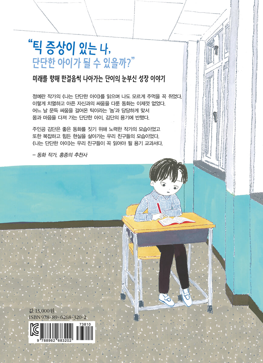 이렇게 치열하고 아픈 자신과의 싸움을 다룬 동화는 이제껏 없었다. 어느 날 문득 싸움을 걸어온 틱이라는 ‘놈’과 당당하게 맞서 몸과 마음을 다져 가는 단단한 아이, 김단의 용기에 반했다. 주인공 김단은 좋은 동화를 짓기 위해 노력한 작가의 모습이었고 또한 복잡하고 힘든 현실을 살아가는 우리 친구들의 모습이었다. 『나는 단단한 아이』는 우리 친구들이 꼭 읽어야 될 용기 교과서다. - 홍종의 (동화 작가) |